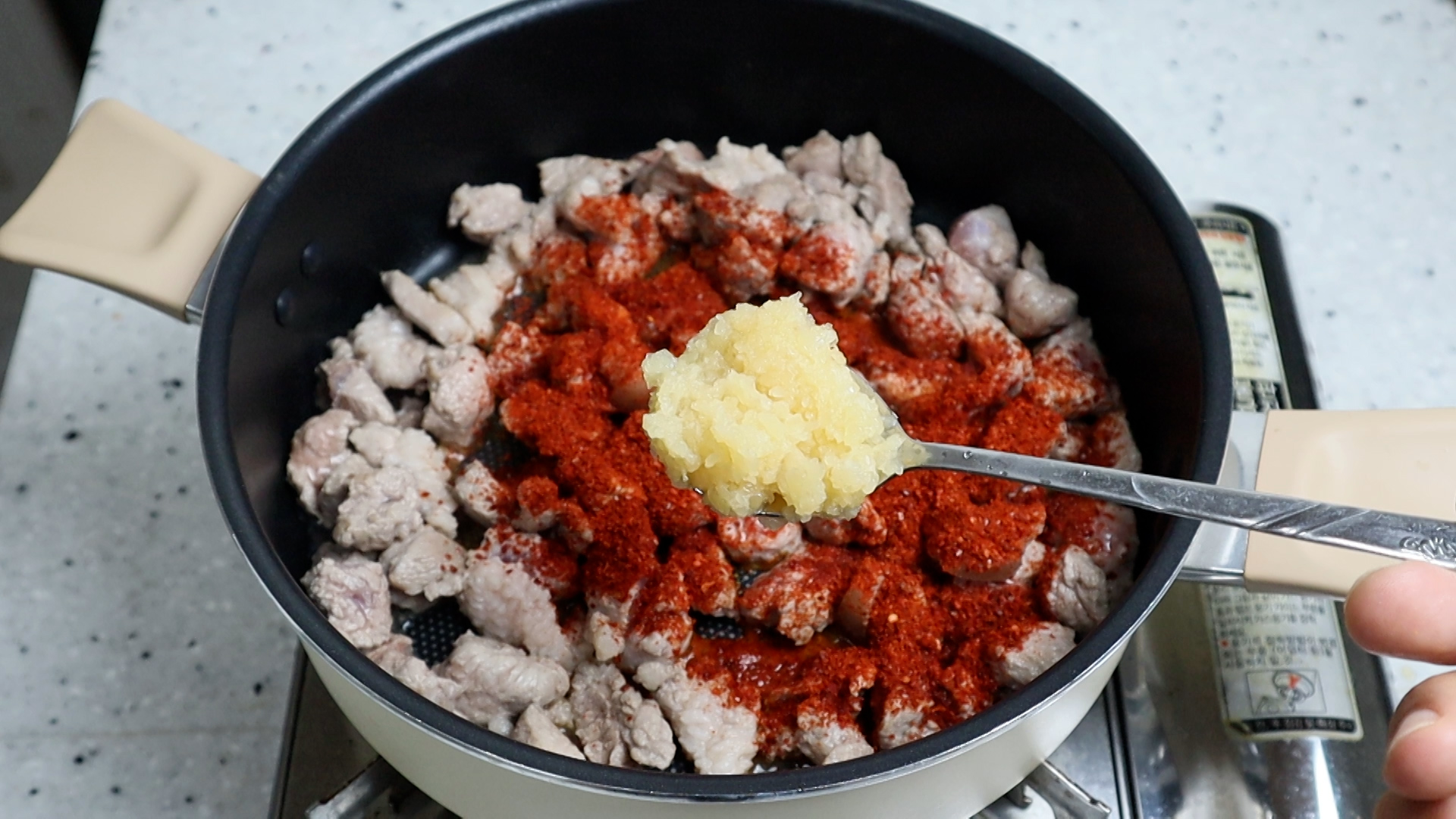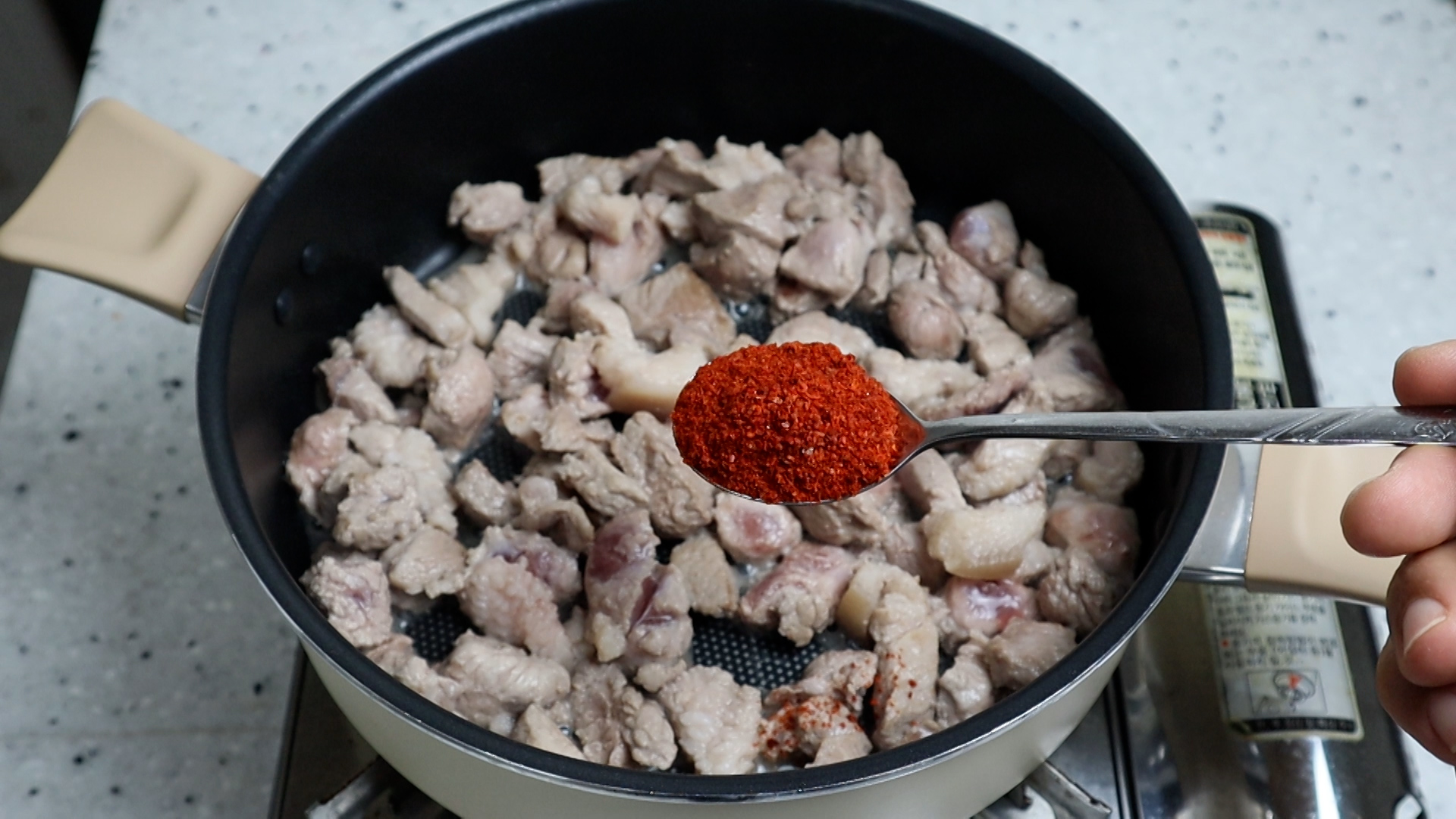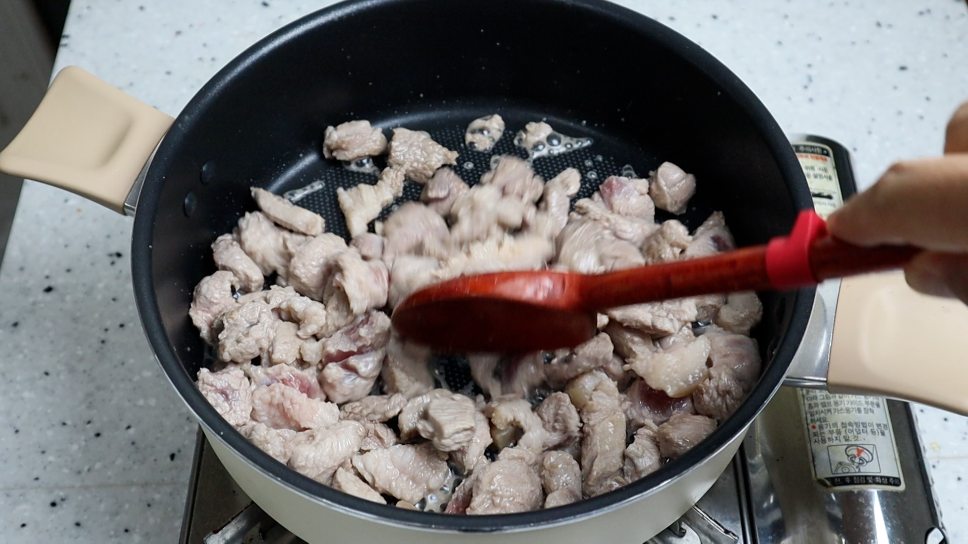 8. 코팅된 냄비나 웍을 강불로 달궈서 기름기가 적당한 돼지앞다리살 300g 넣고 핏기 없게 2분 정도 볶아주세요.