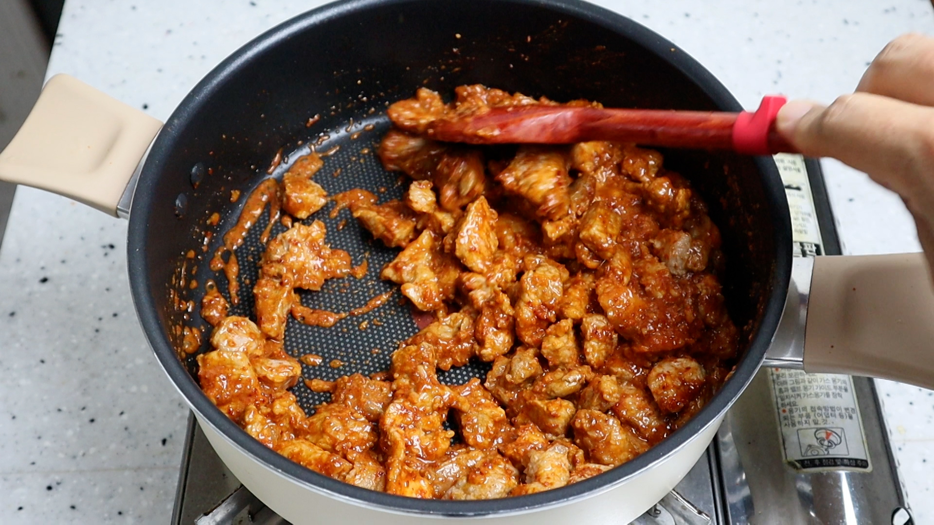 14. 양념을 넣고 중불로 불을 바꾸고 2분 정도 볶아주세요.