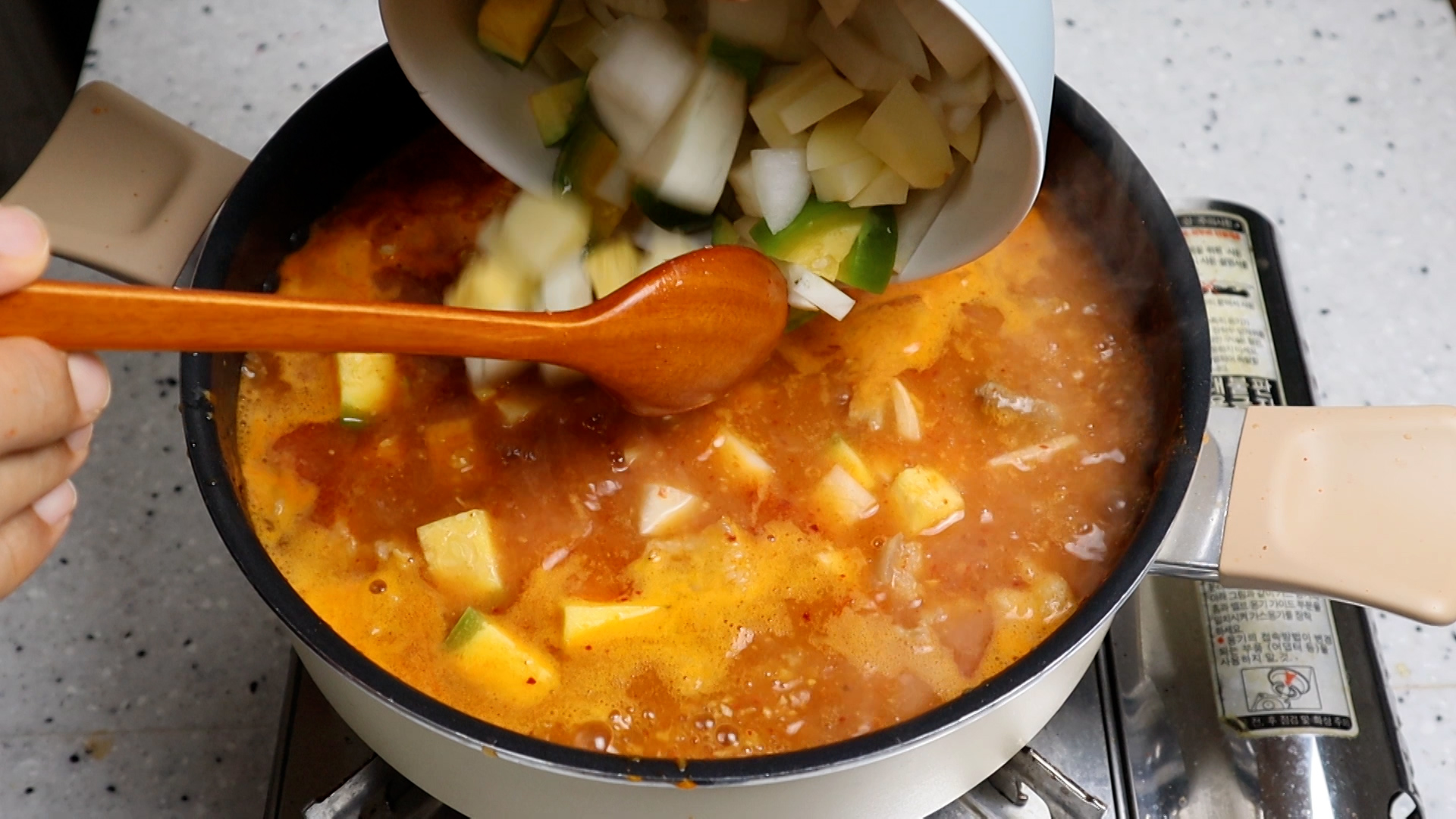 18. 부글부글 끓어 오르면 무, 감자, 양파, 호박, 두부를 넣어주세요. 호박식감이 좀 아삭아삭 한걸 좋아하시면 호박은 대파 들어갈때 넣어주세요.