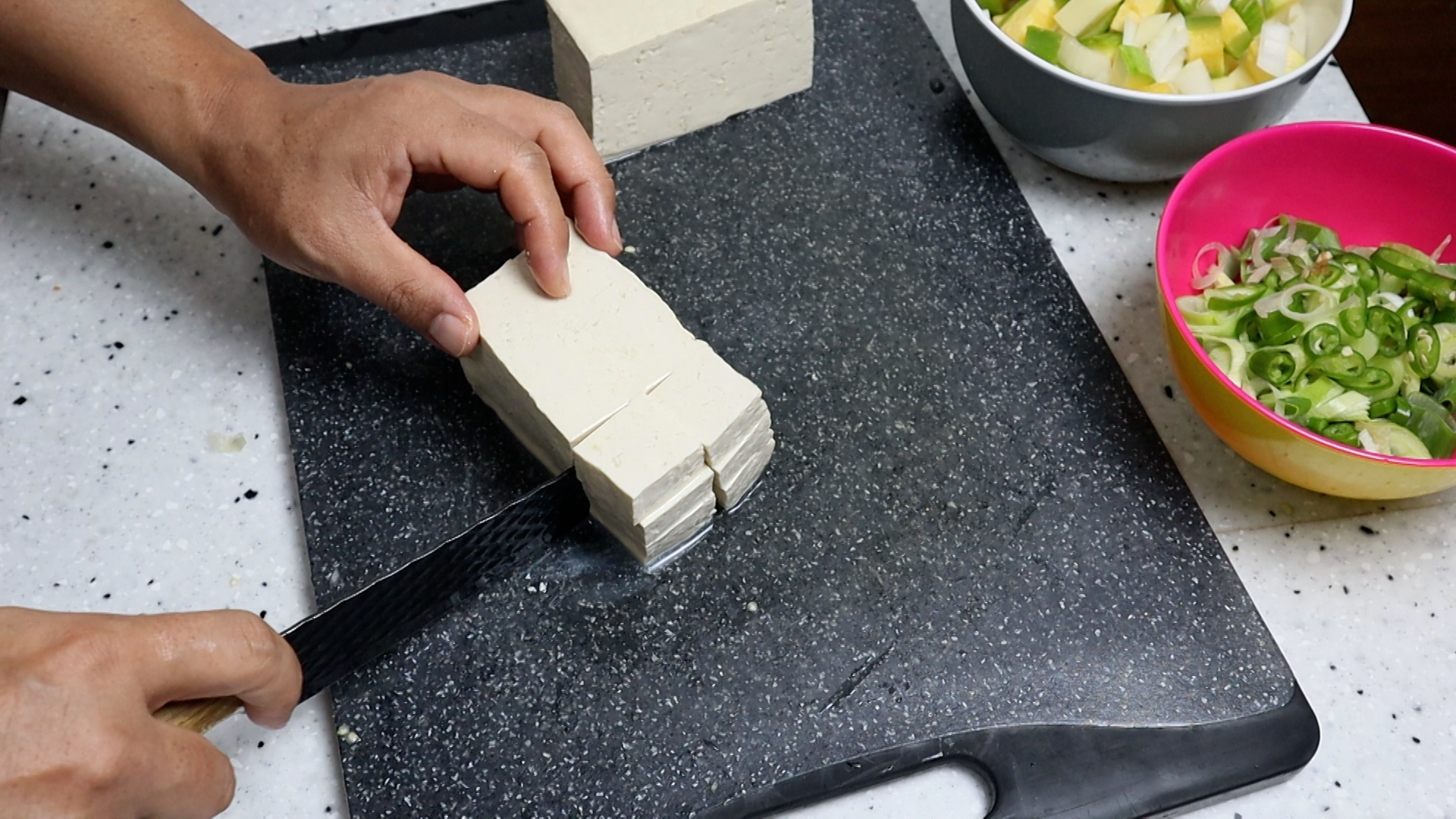7. 두부는 무조건 단단한걸로 반모 기호에 맞게 썰어준비해주세요.