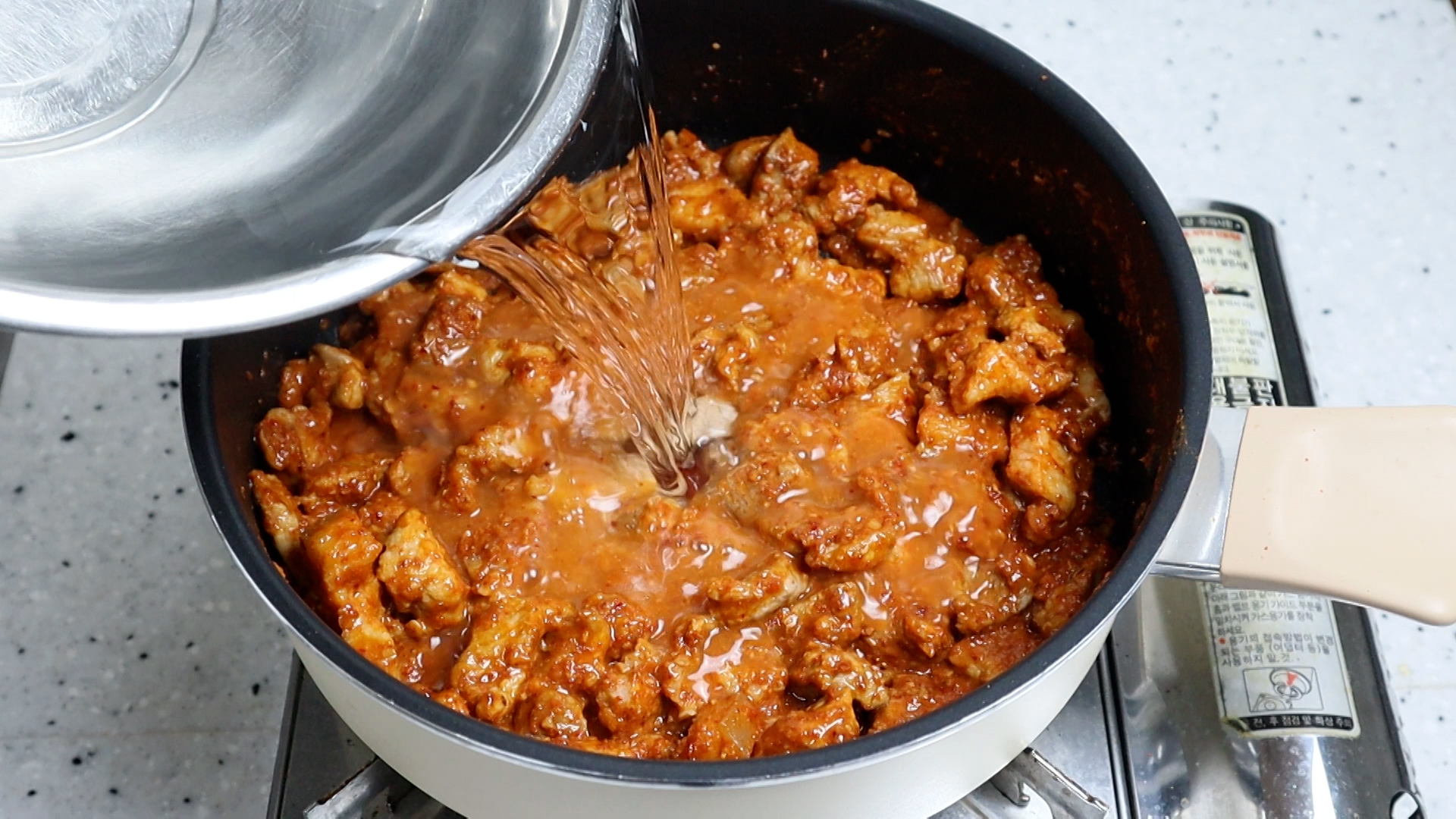 15. 물을 부어주세요. 간을 평소 좀 싱겁게 드시는 분들은 물 100cc 더 추가하셔도 좋습니다.