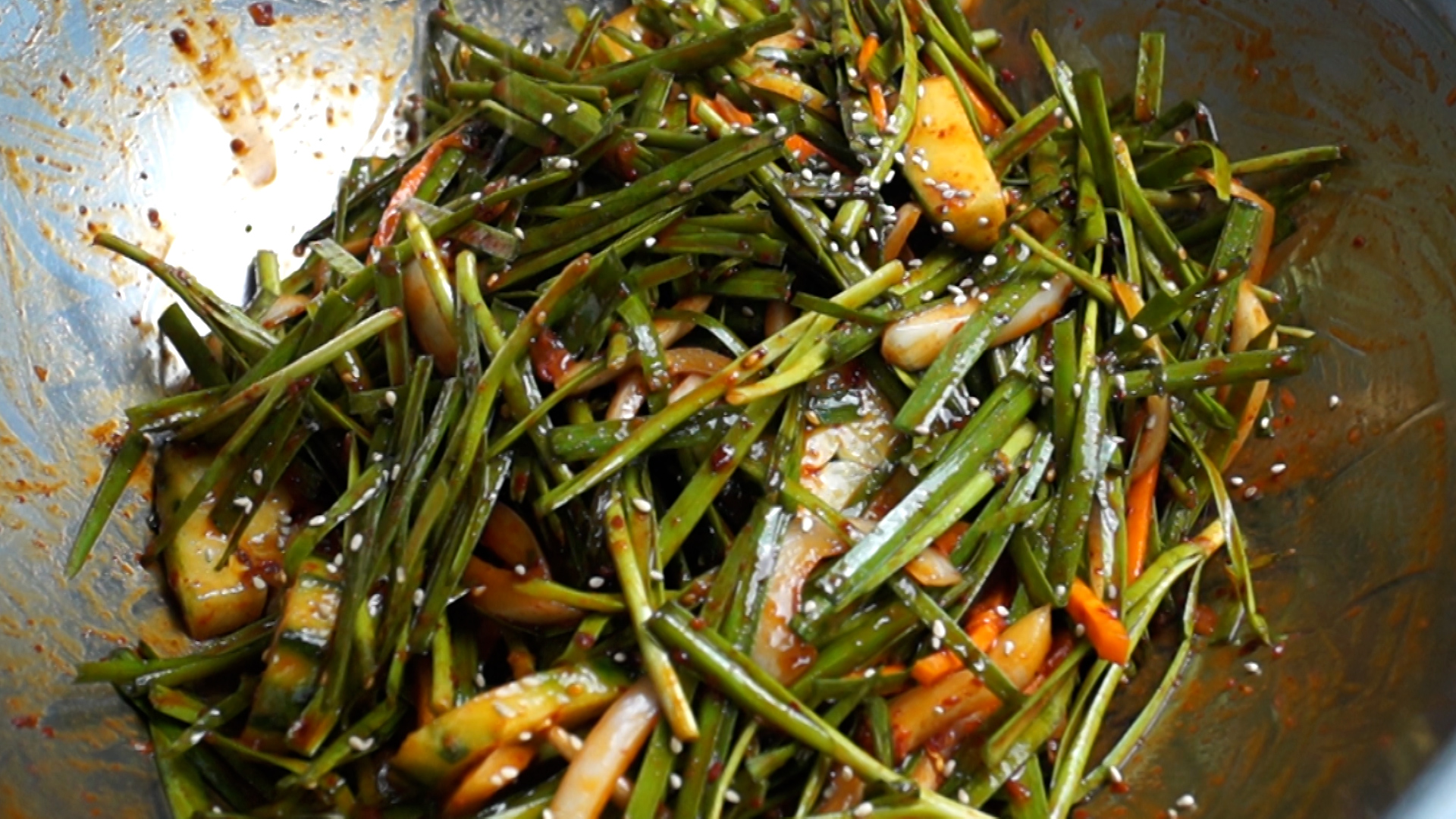 20. 활력보강에 좋다고 소문난 부추를 넣고 너무 힘주지 말고 살랑살랑 무쳐주세요.