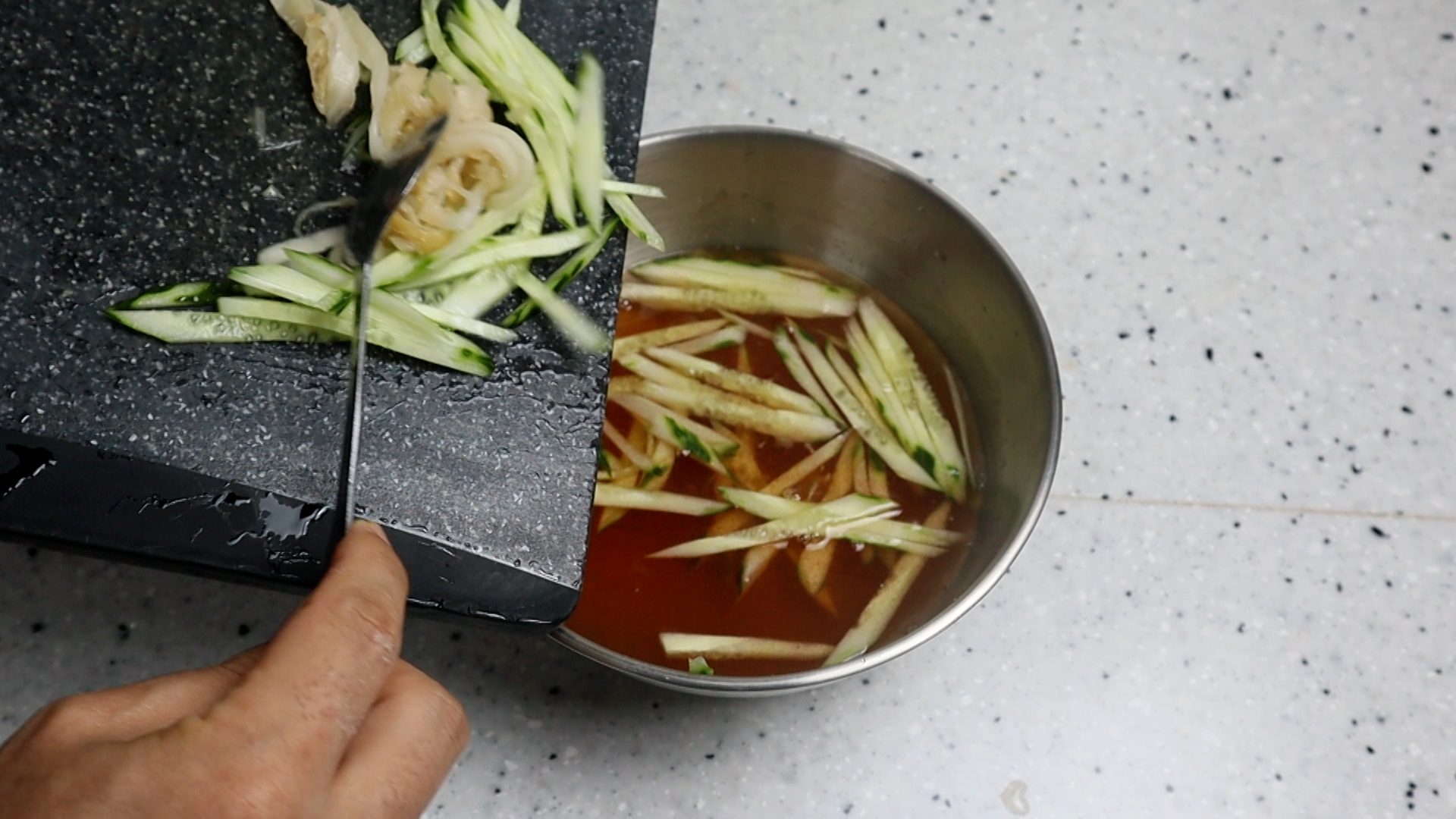 13. 오이와 김치를 육수에 넣어주세요.
