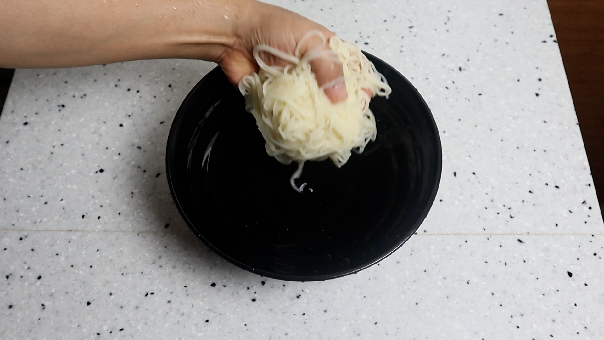16. 물기를 꽉! 짜서 그릇에 국수를 넣어주세요.