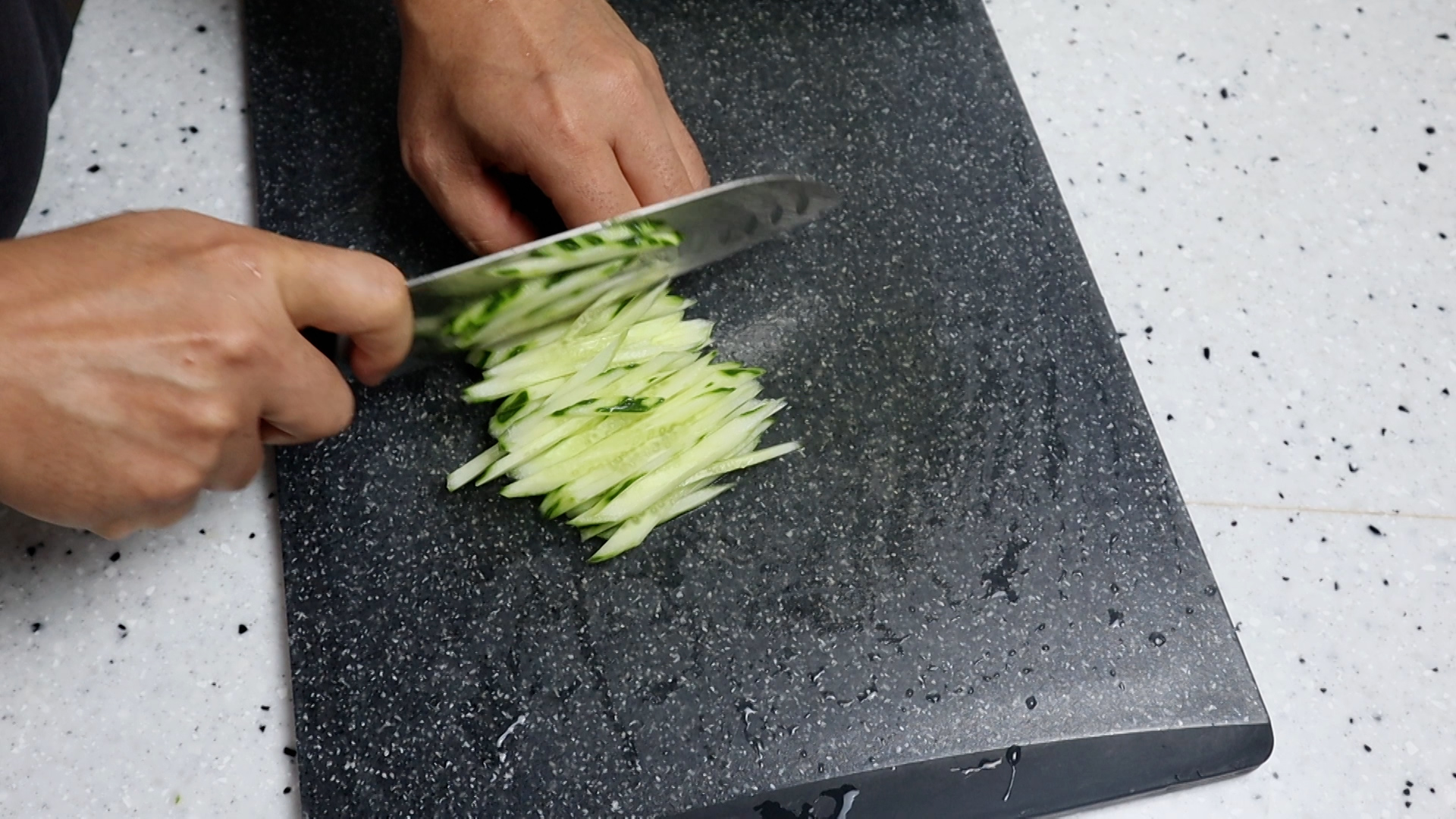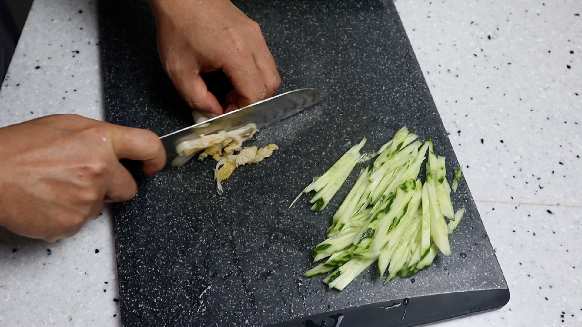 1. 오이는 두께감이 살짝 있게 3~4mm 로 채를 썰어주세요.