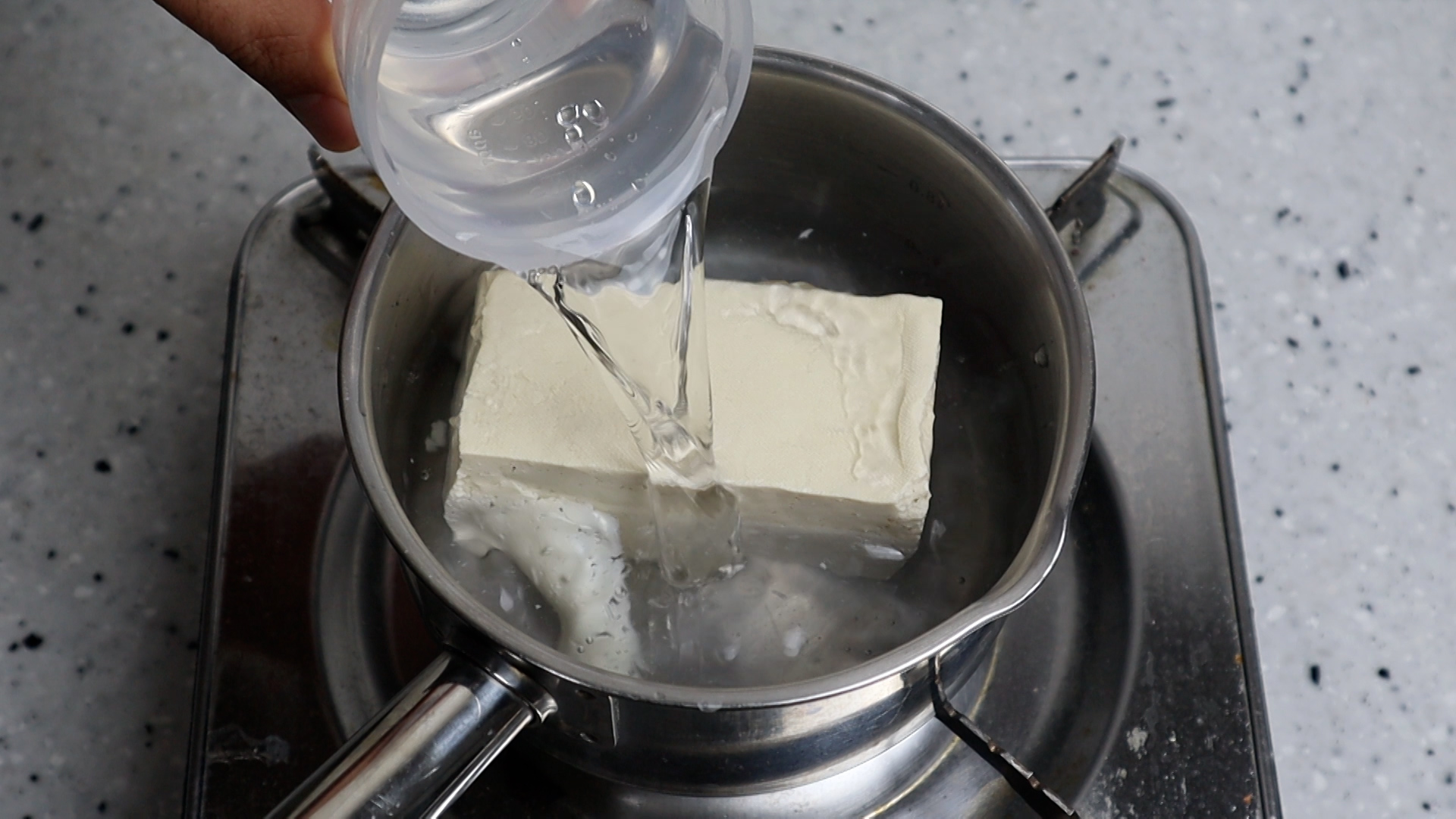 1. 두부 반모를 냄비에 넣고 물 3컵을 부어주세요. 냄비는 폭이 좁고 깊은걸 사용하시면 좋습니다.