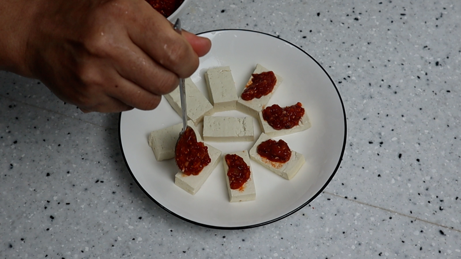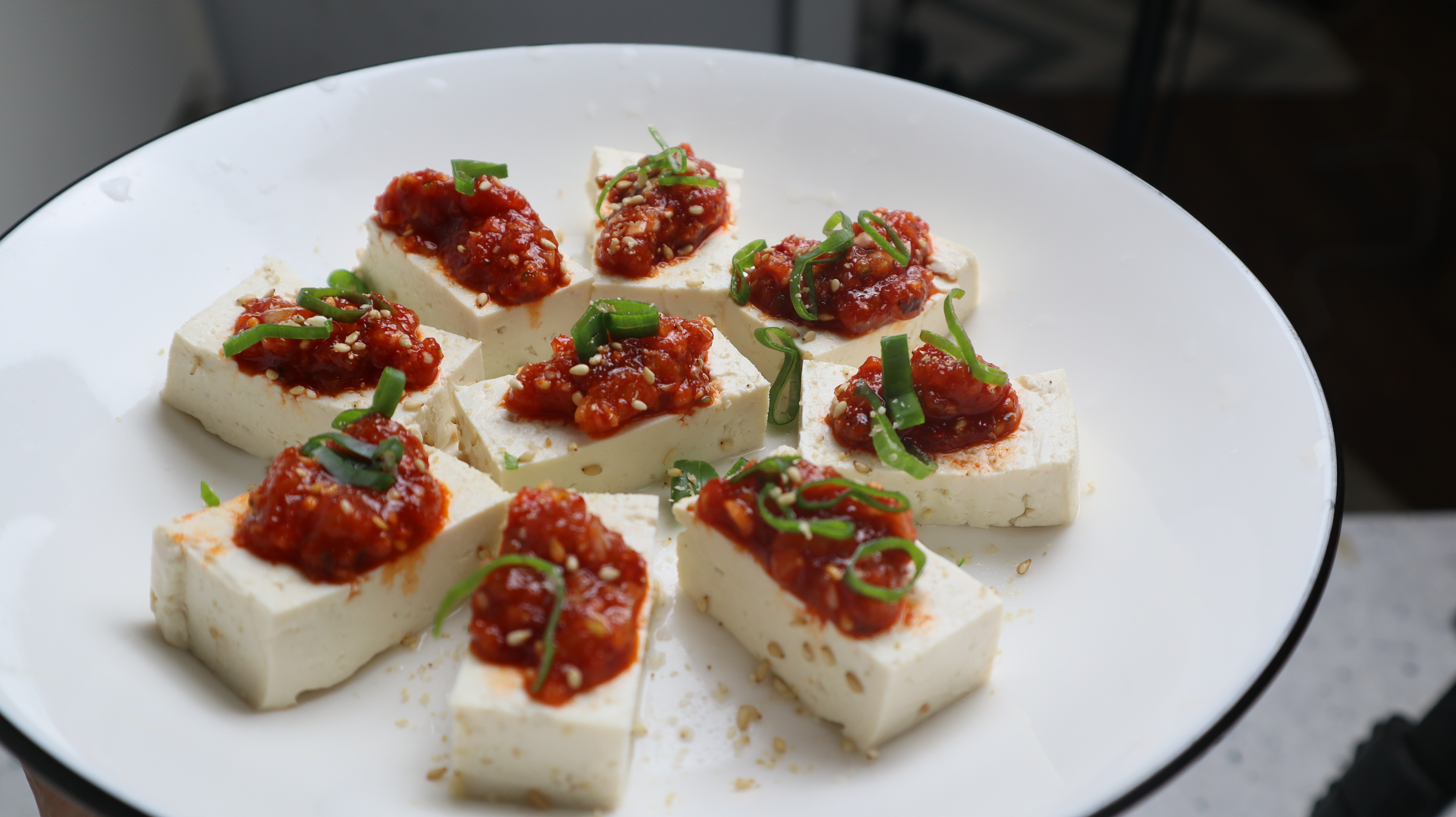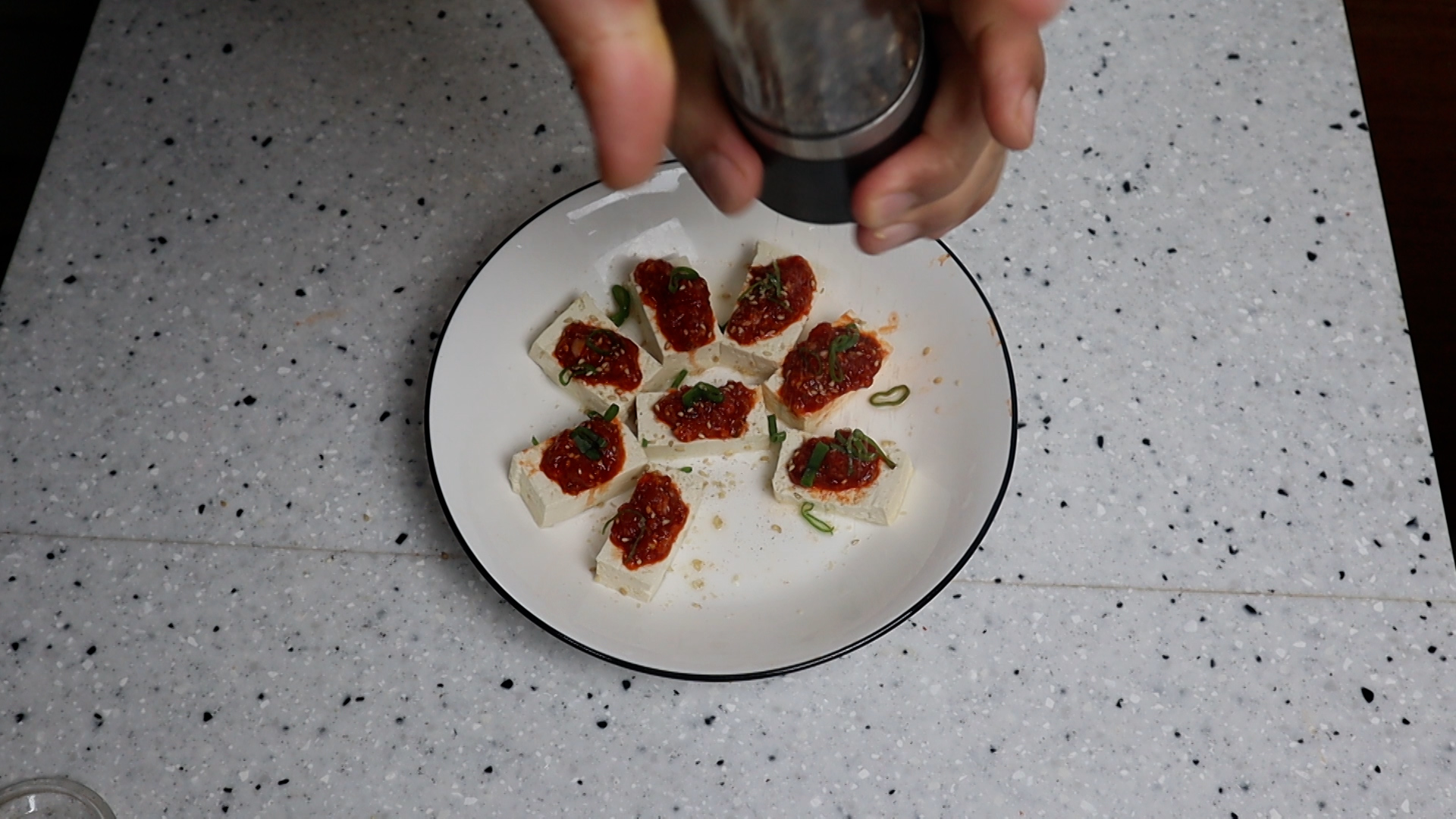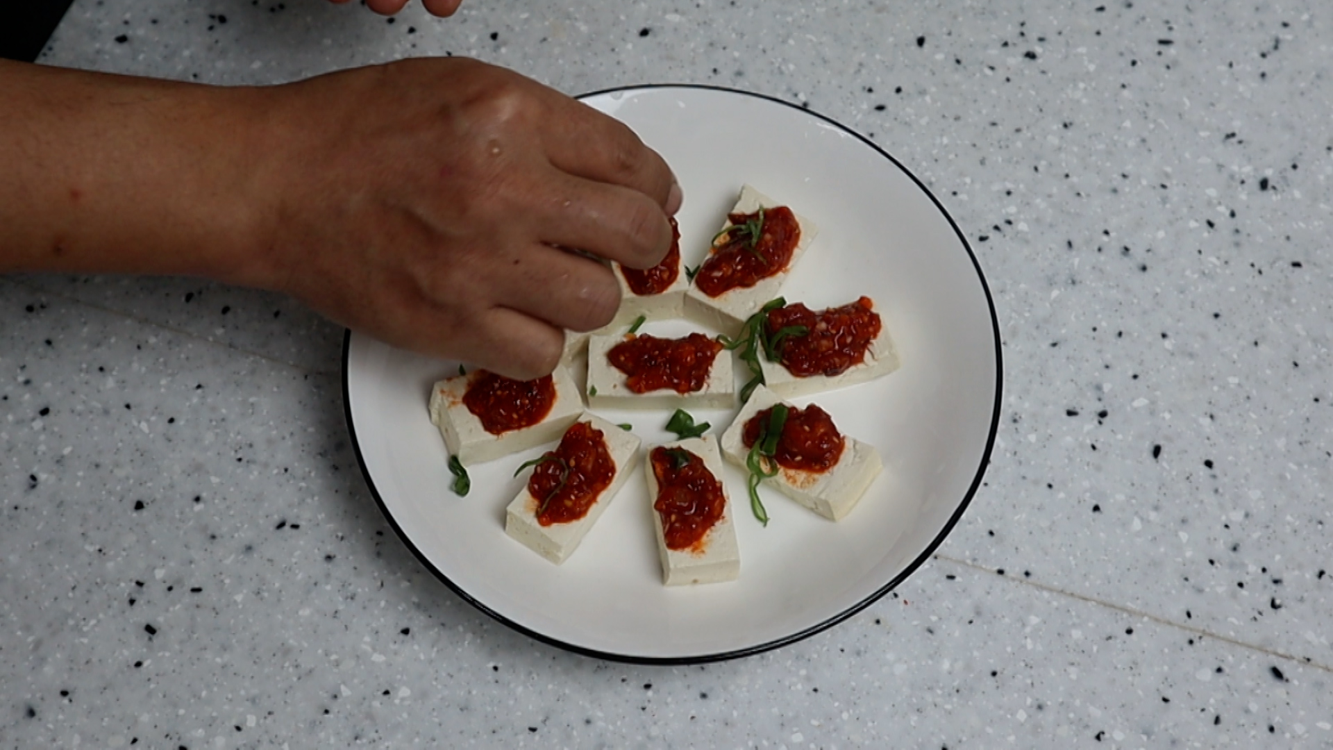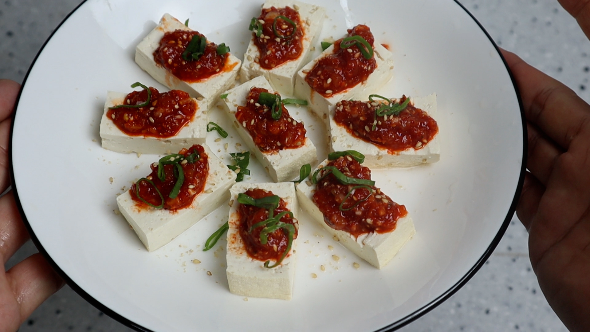 25. 접시위에 두부를 올린다음 만들어둔 양념을 듬뿍듬뿍 올려주세요.