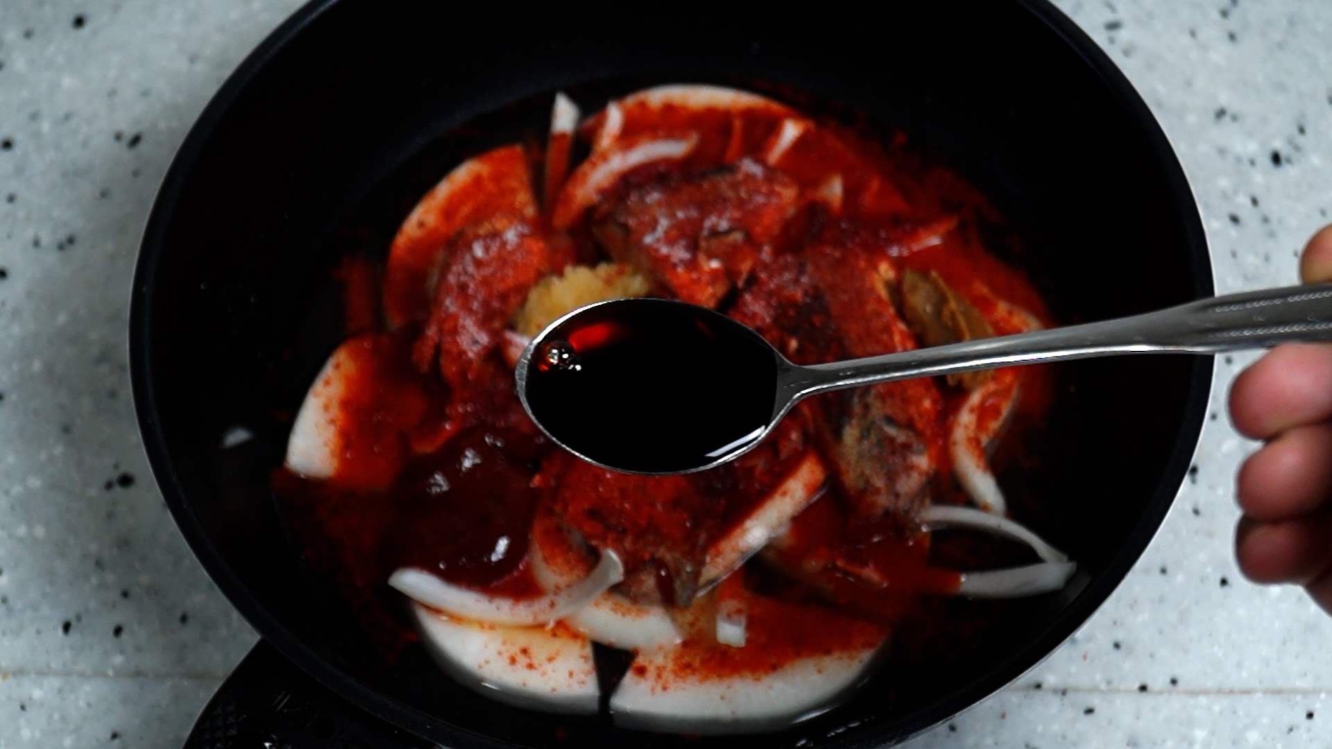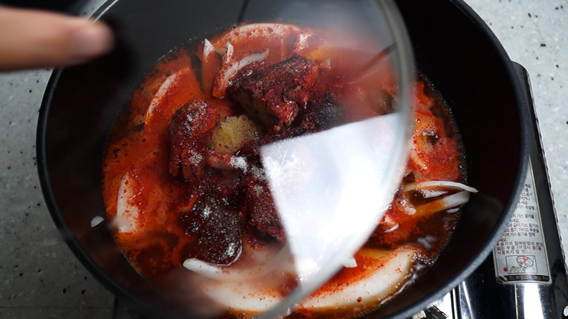 10. 양념을 전부 넣어주세요. 미림이 없으면 어젯밤 먹다남은 쏘주를 부어주세요.