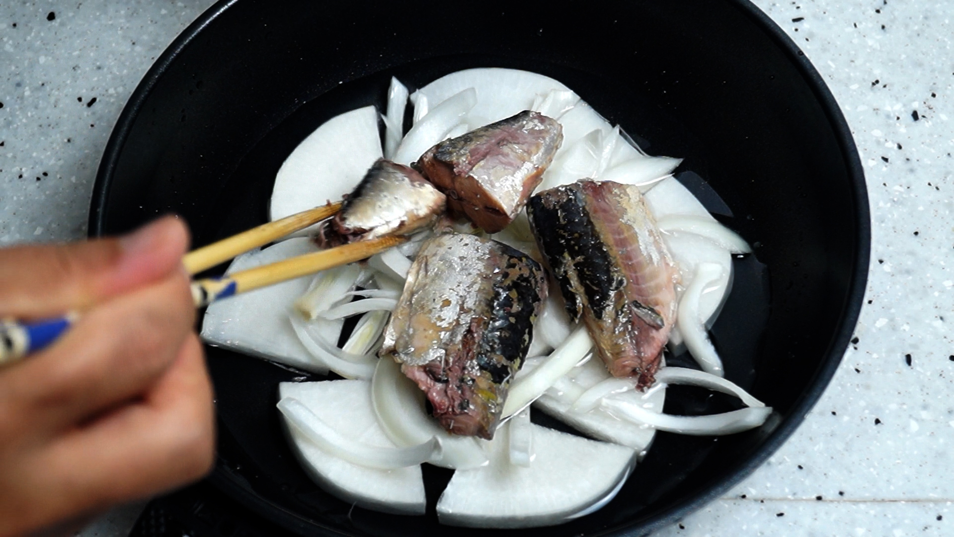 9. 건더기만 건져 무우위에 올려주세요. 통조림 고등어는 참치처럼 그냥 바로 드셔도 아무 문제가 없어요~