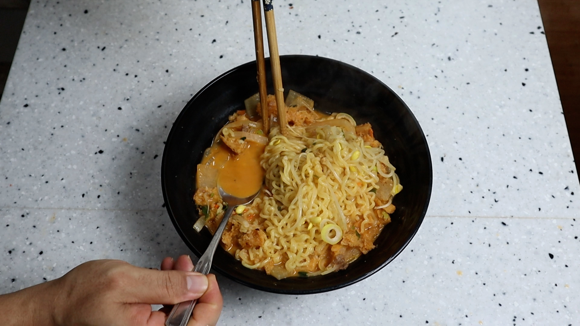 16. 집집마다 화력이 조금씩 다르니 라면 완성 1분전 국물 맛을 살짝 보고 짜다 싶으면 물 50~60cc 를 더 넣어주세요.