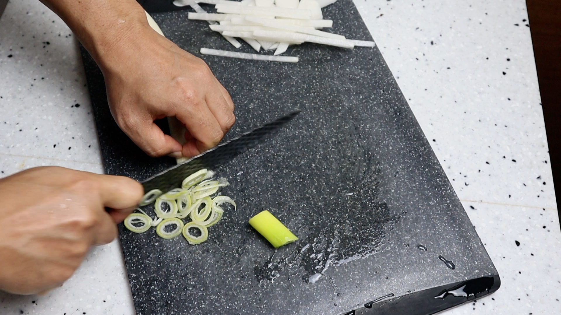 3. 대파는 얇게얇게 썰어주세요. 후첨 넣을거라 두꺼우면 안됩니다.