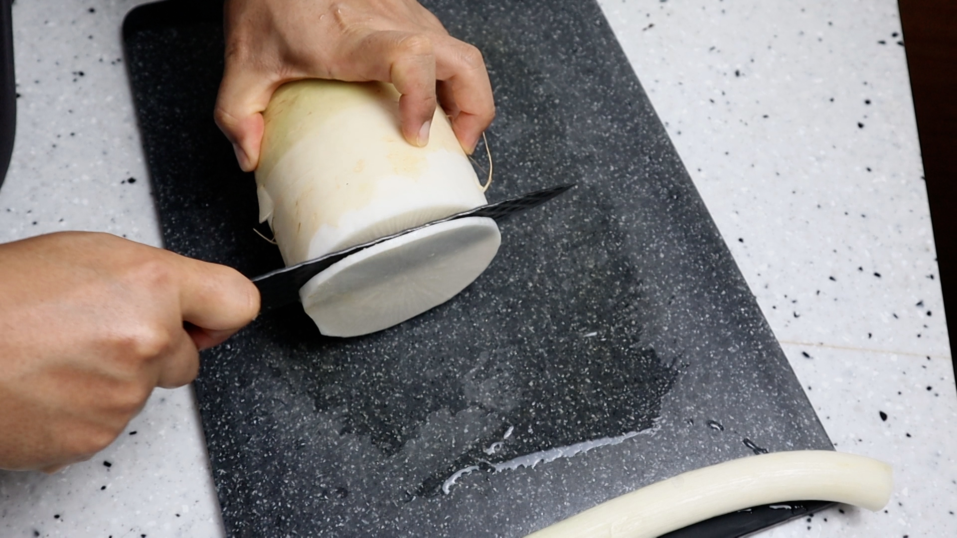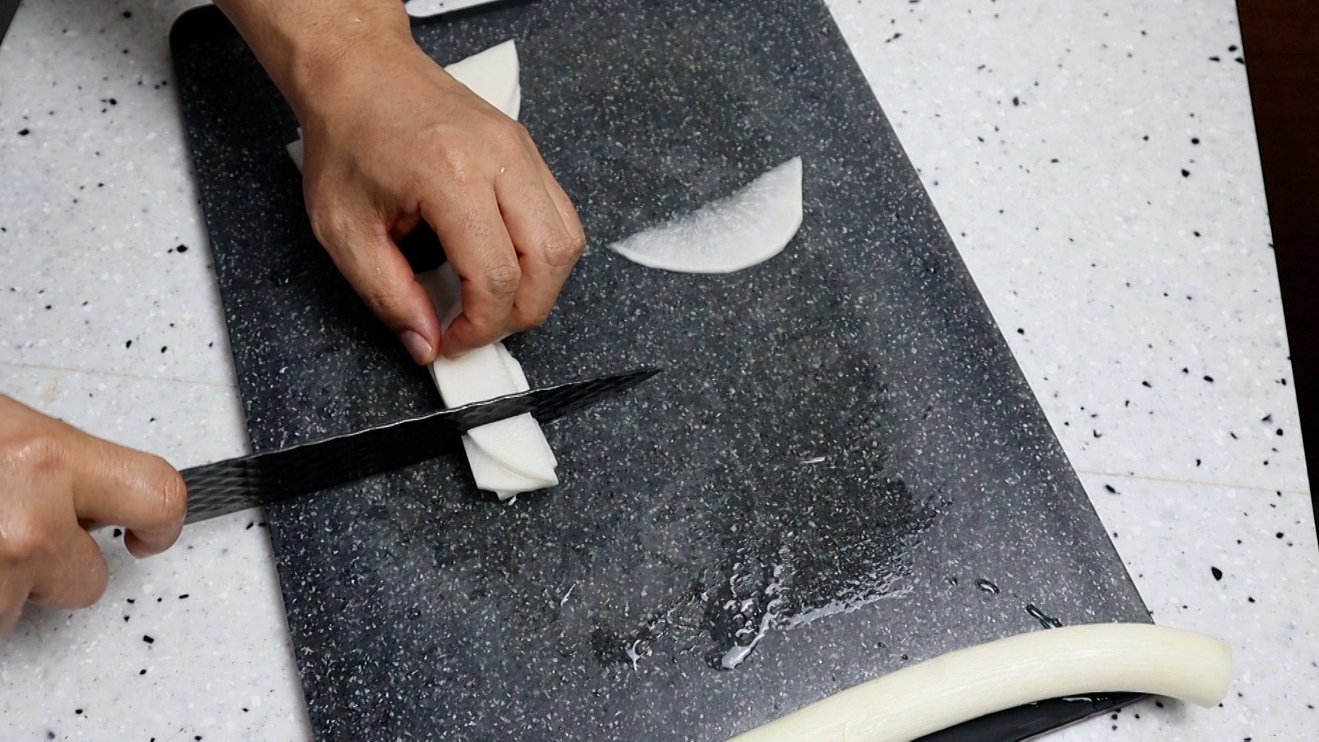 1. 무는 3~4mm 로 2~3조각 얇게 썰어주세요.