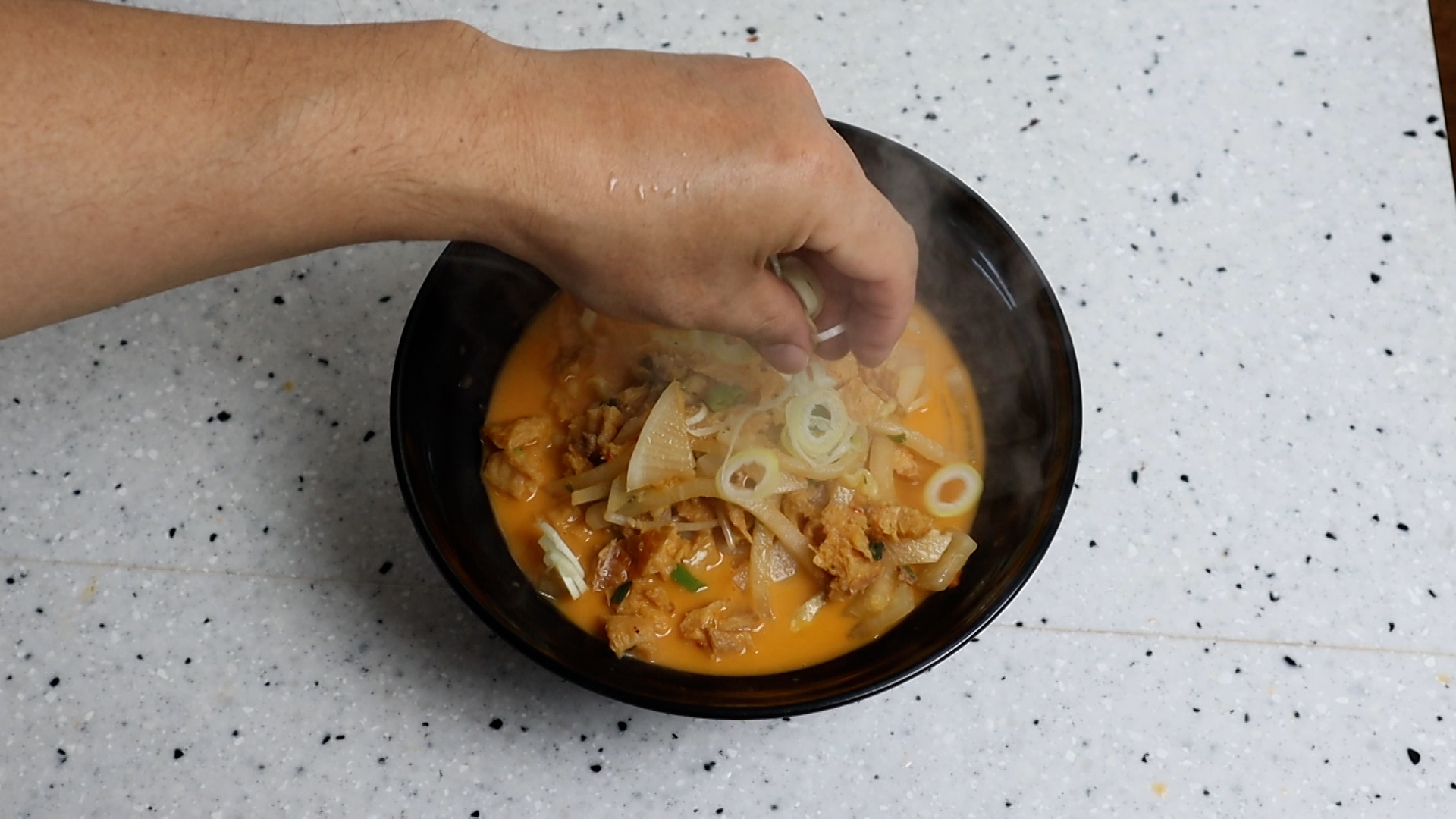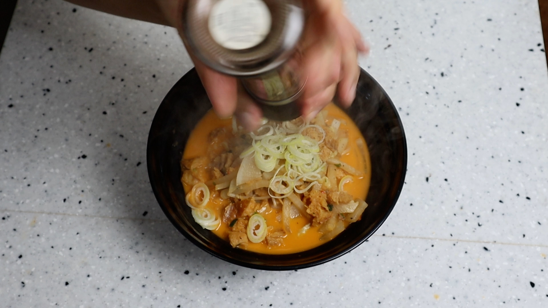 13. 분말 스프와 건더기 스프를 전부 넣어주세요.