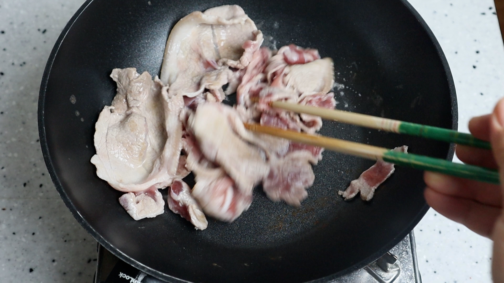 18. 돼지고기 앞다리살을 강불에 1~2분 핏기가 없게 볶아주세요.