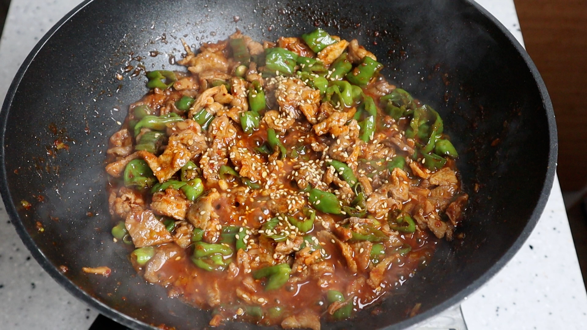 21. 버섯과 꽈리고추를 넣고 40~50초간 더 볶아주세요.