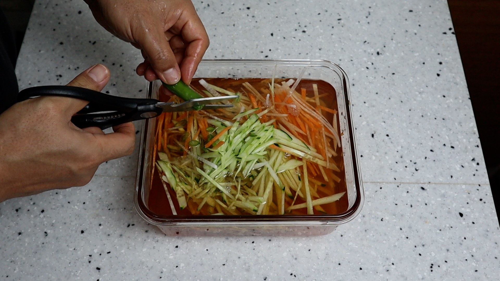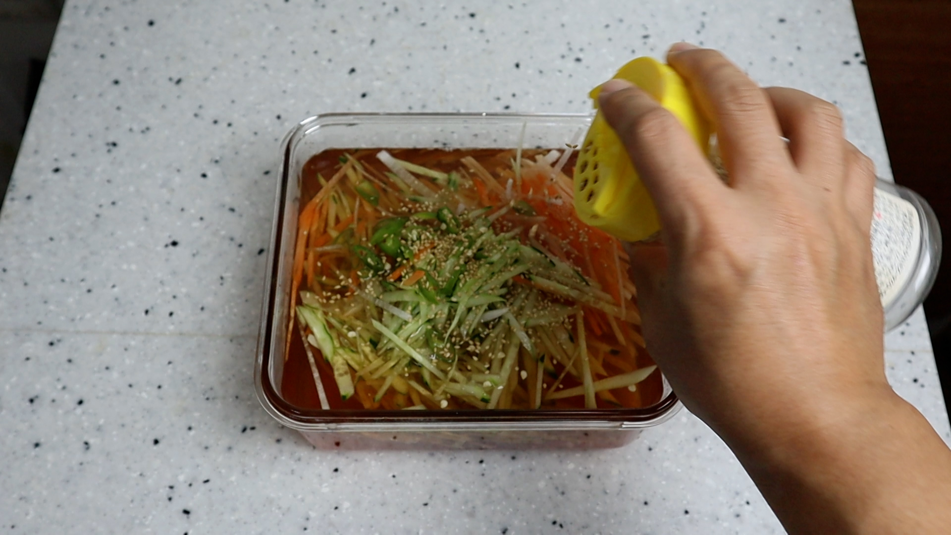 15. 썰어놓은 무우와 당근 오이를 전부 넣어주세요.