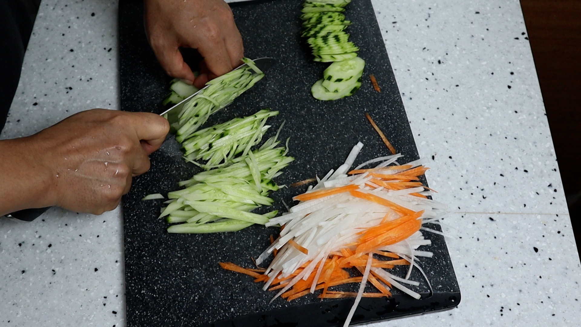 3. 오이는 중간거 1개를 3mm 정도로 채 썰어주세요. 건더기 보다 국물이 많은 버전이라 건더기 넉넉한게 좋은 분들은 오이를 2배로 넣으세요.