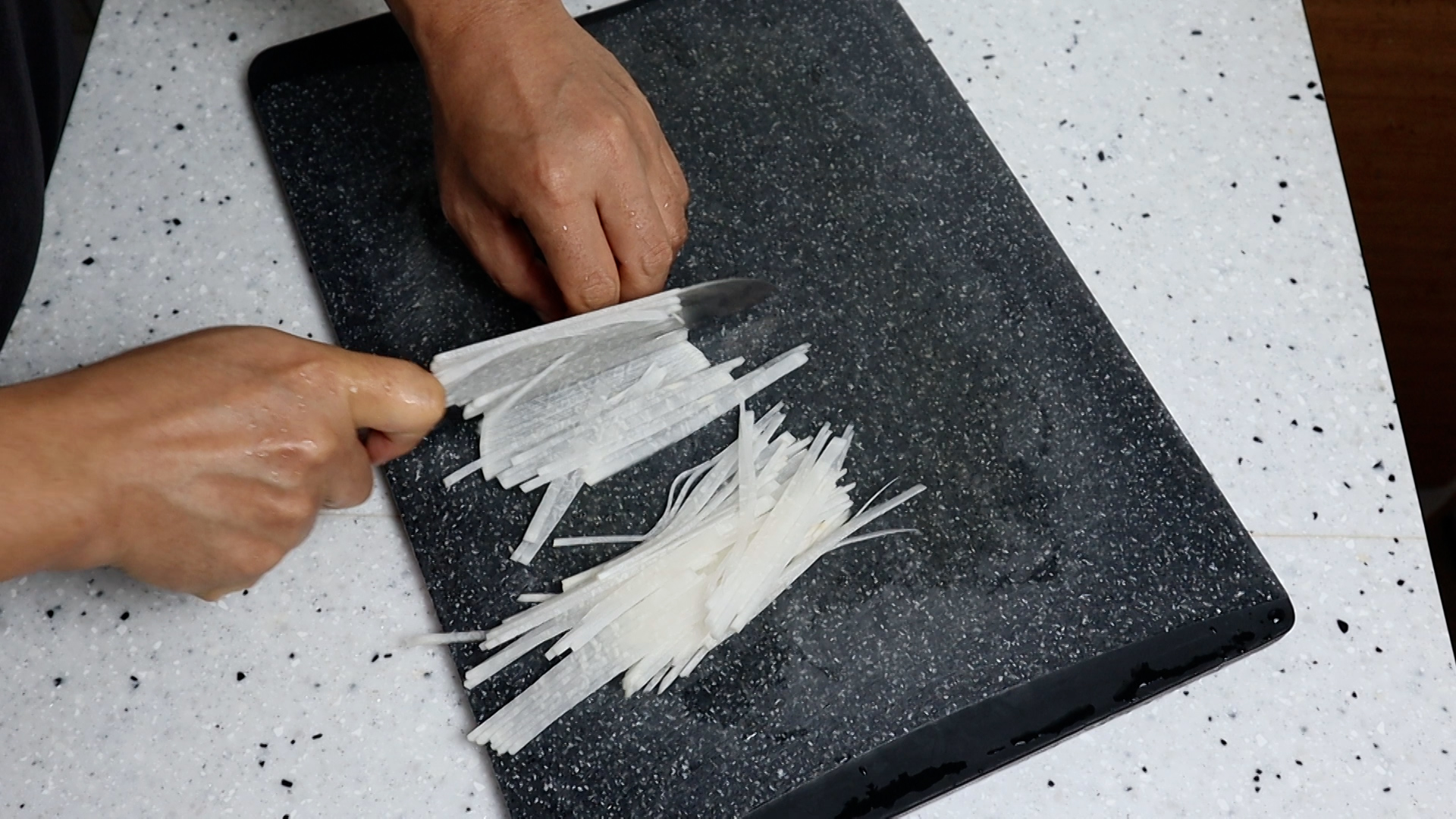 1. 무는 2mm 정도 두께로 최대한 얇게 썰어주세요. 채써는게 힘들땐 채칼로 미시면 됩니다.