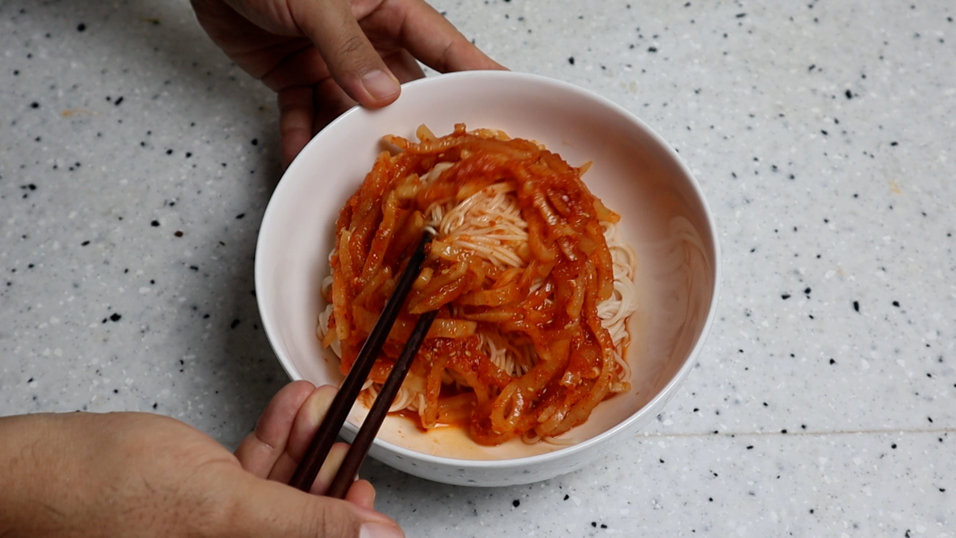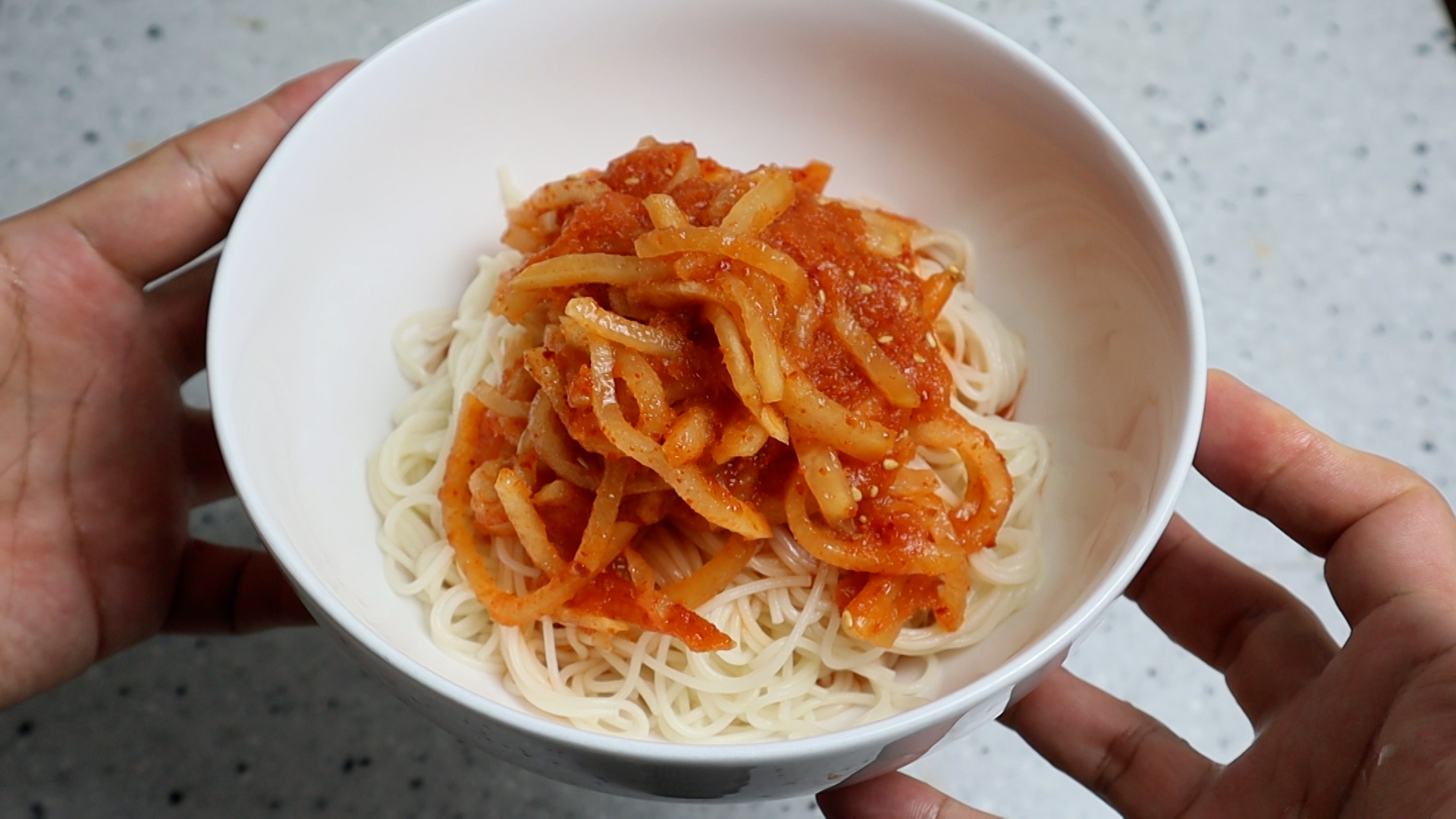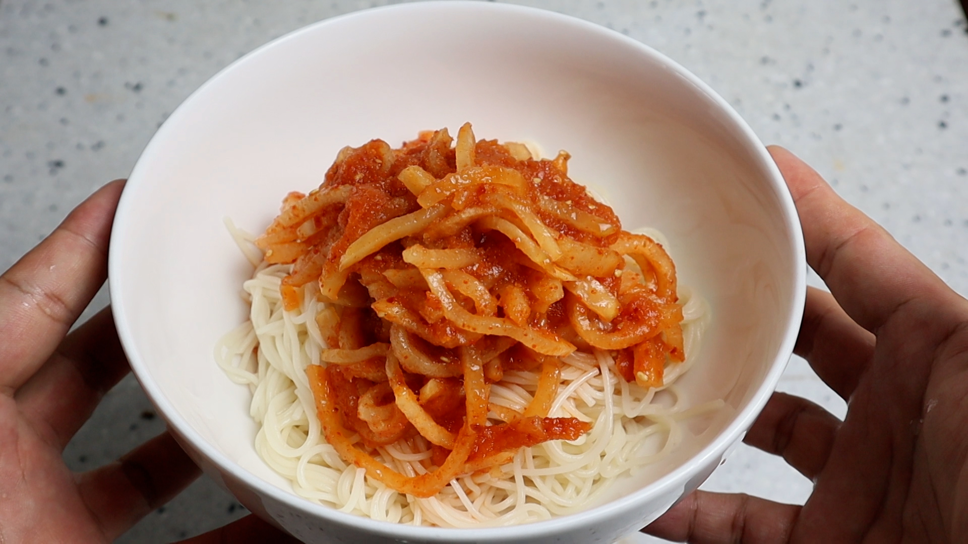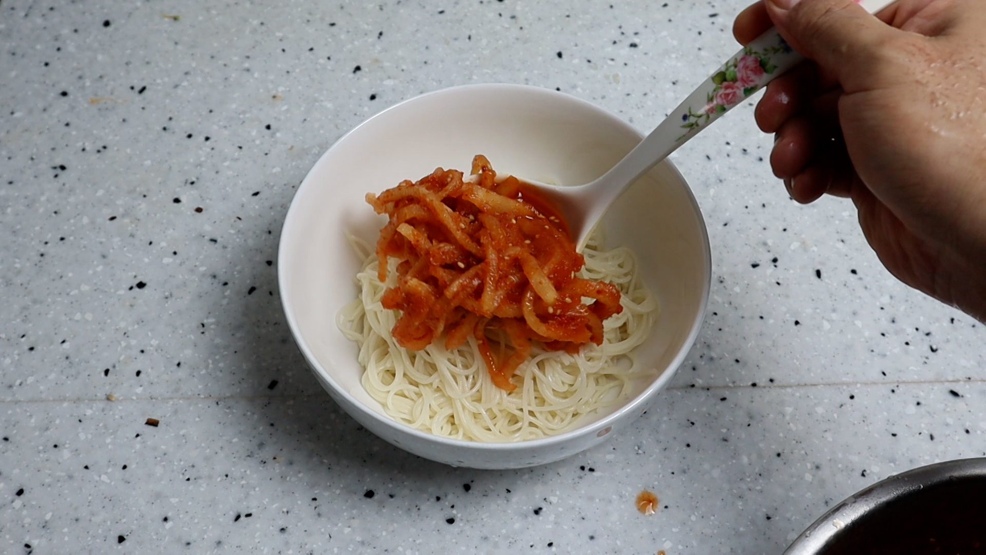 20. 국수를 그릇에 담고 무 건더기를 한국자 듬뿍 올려주세요.