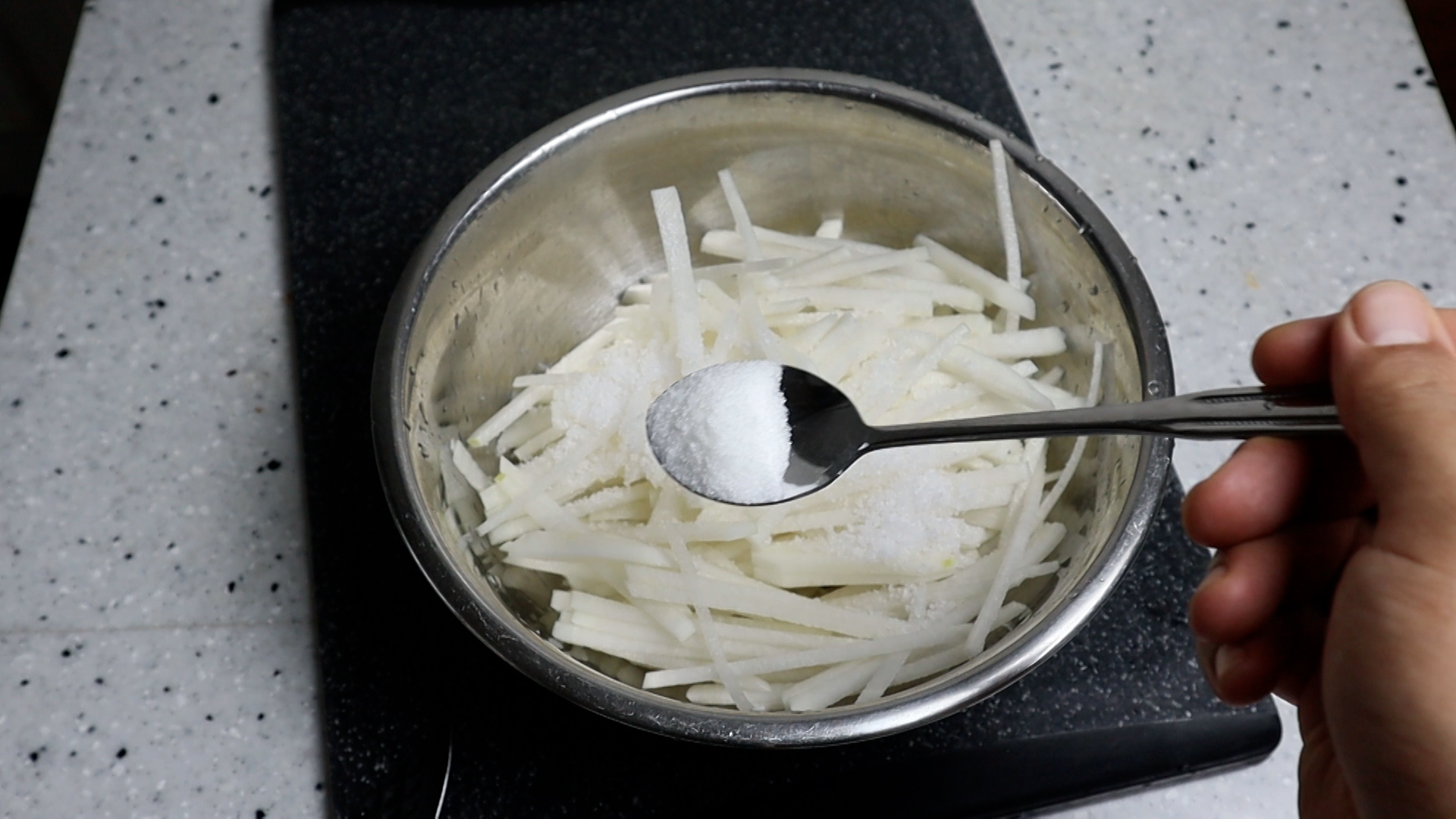 2. 무를 볼에 넣고 꽃소금을 넣어주세요.