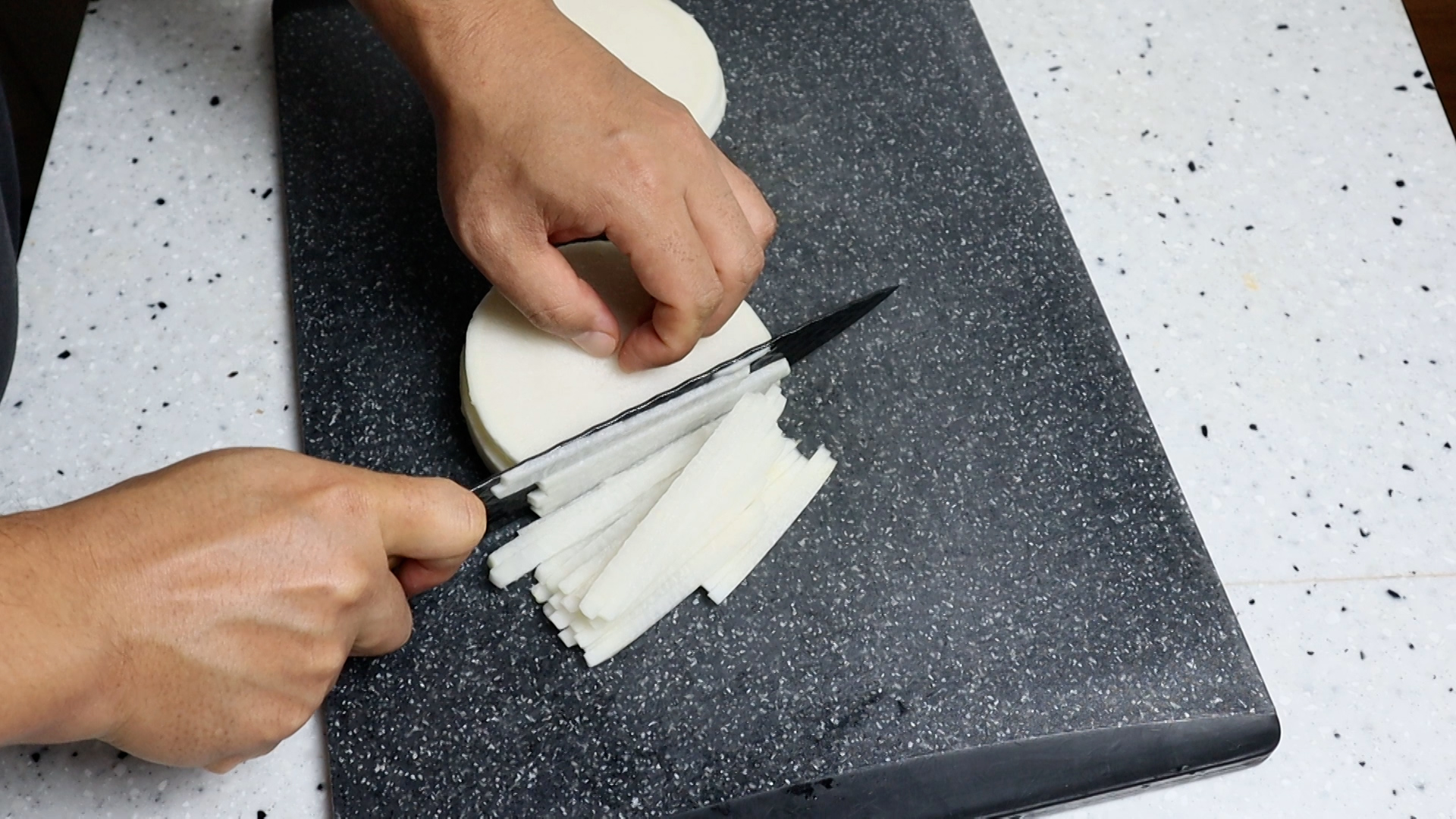1. 무우는 3mm 두께로 채를 썰어주세요.