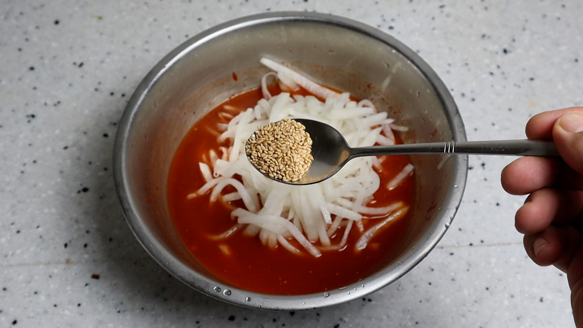 17. 무우와 양념을 골고루 섞어주세요.