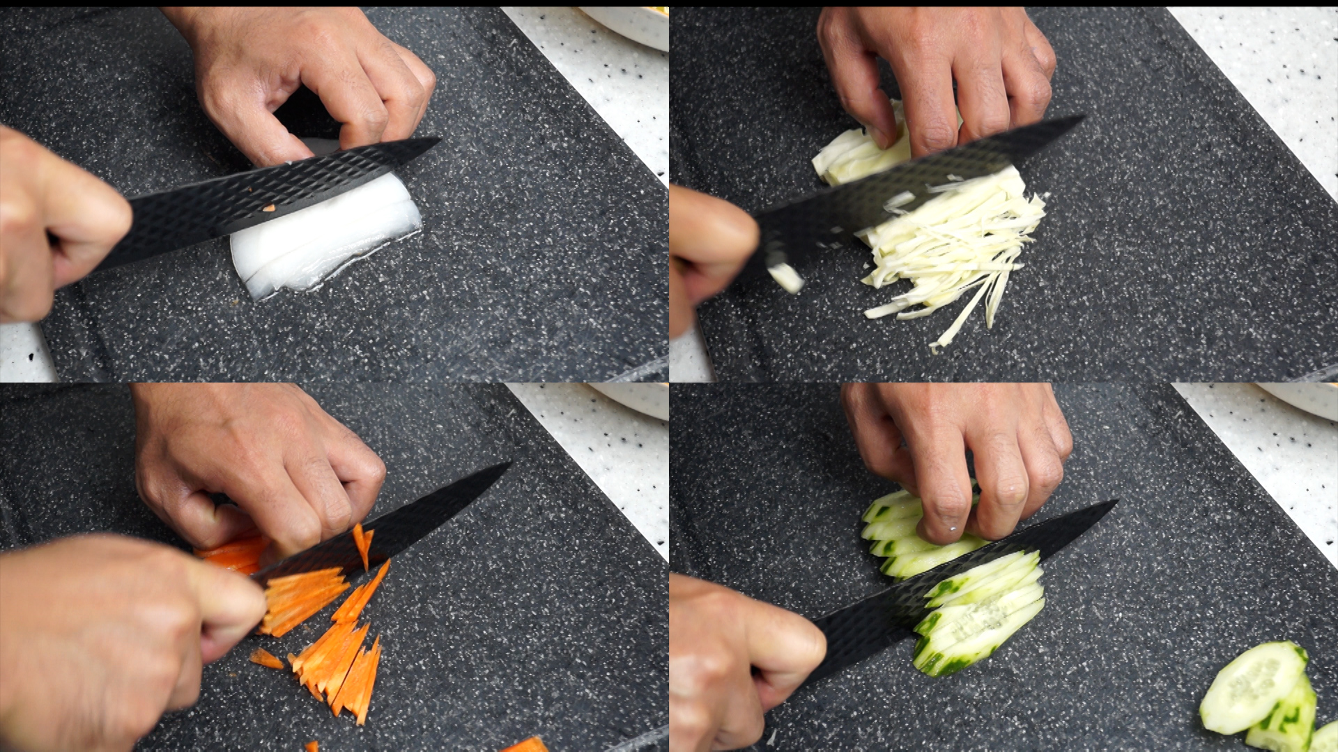 19. 야채는 기호에 따라 상추 양배추 당근 오이 깻잎 양파 등을 듬뿍뜸뿍 채썰어 준비해주세요.