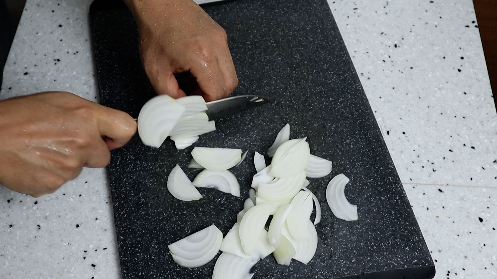 11. 양파는 잘게 채 썰어서 준비해주세요.
