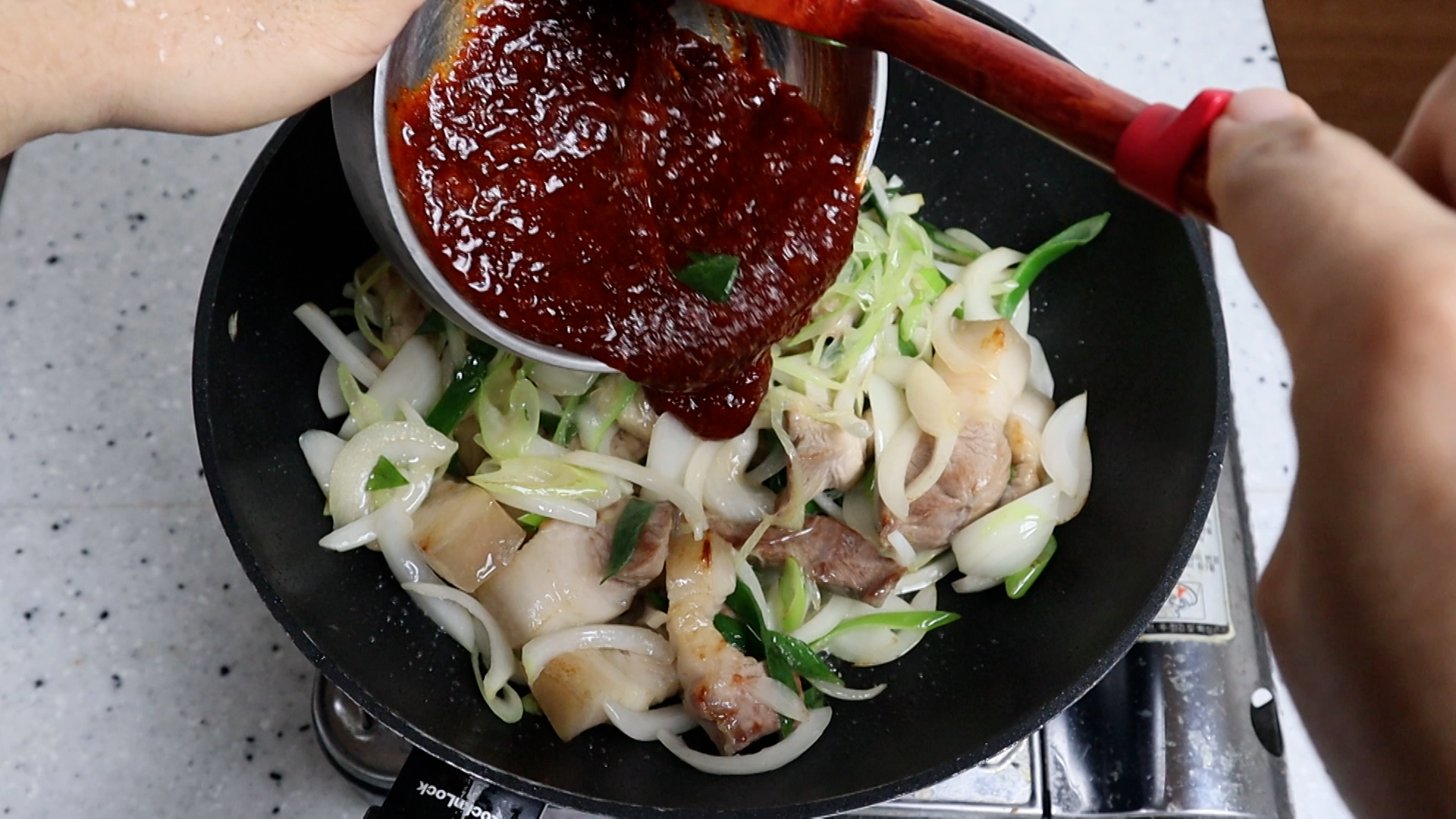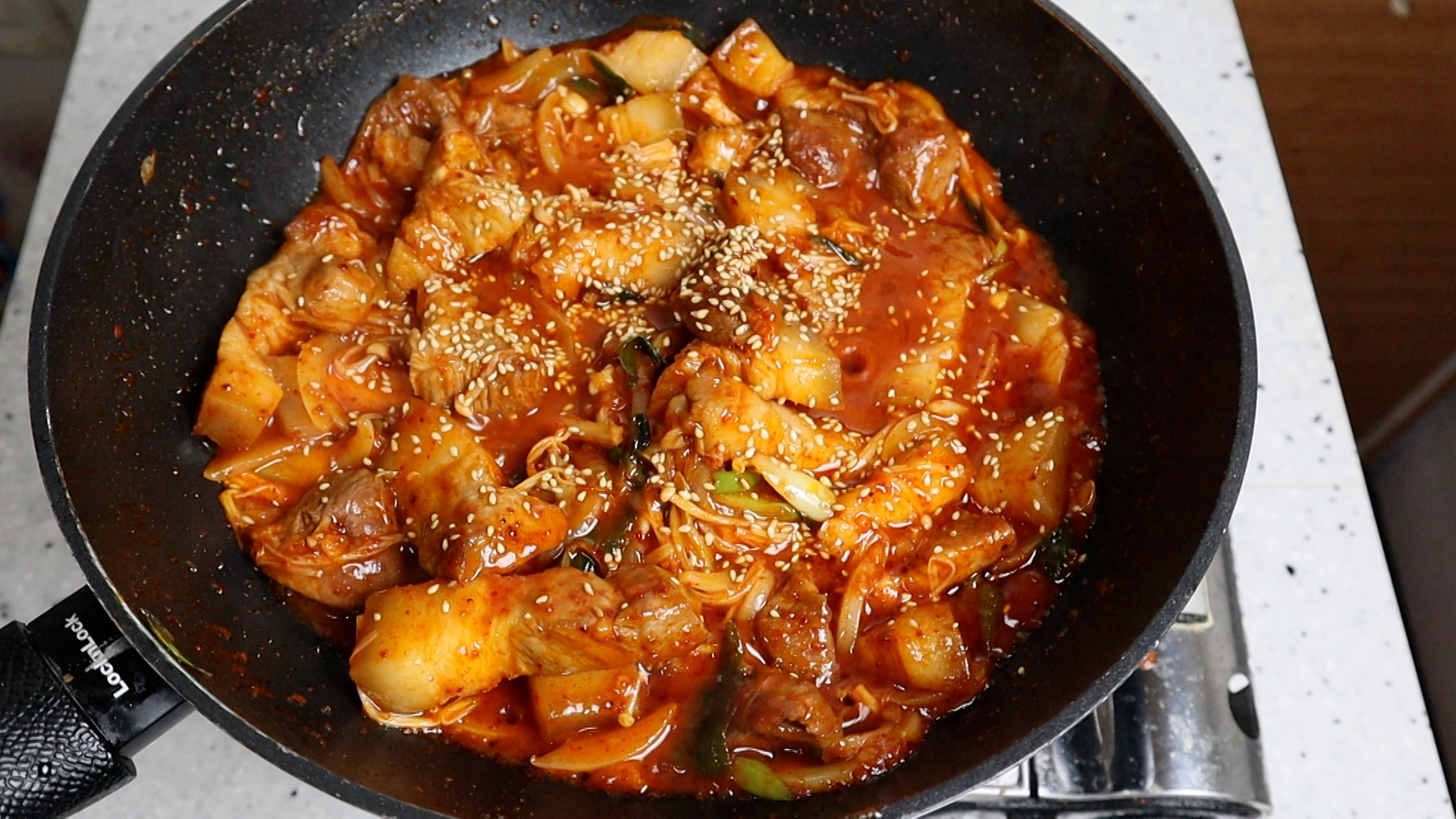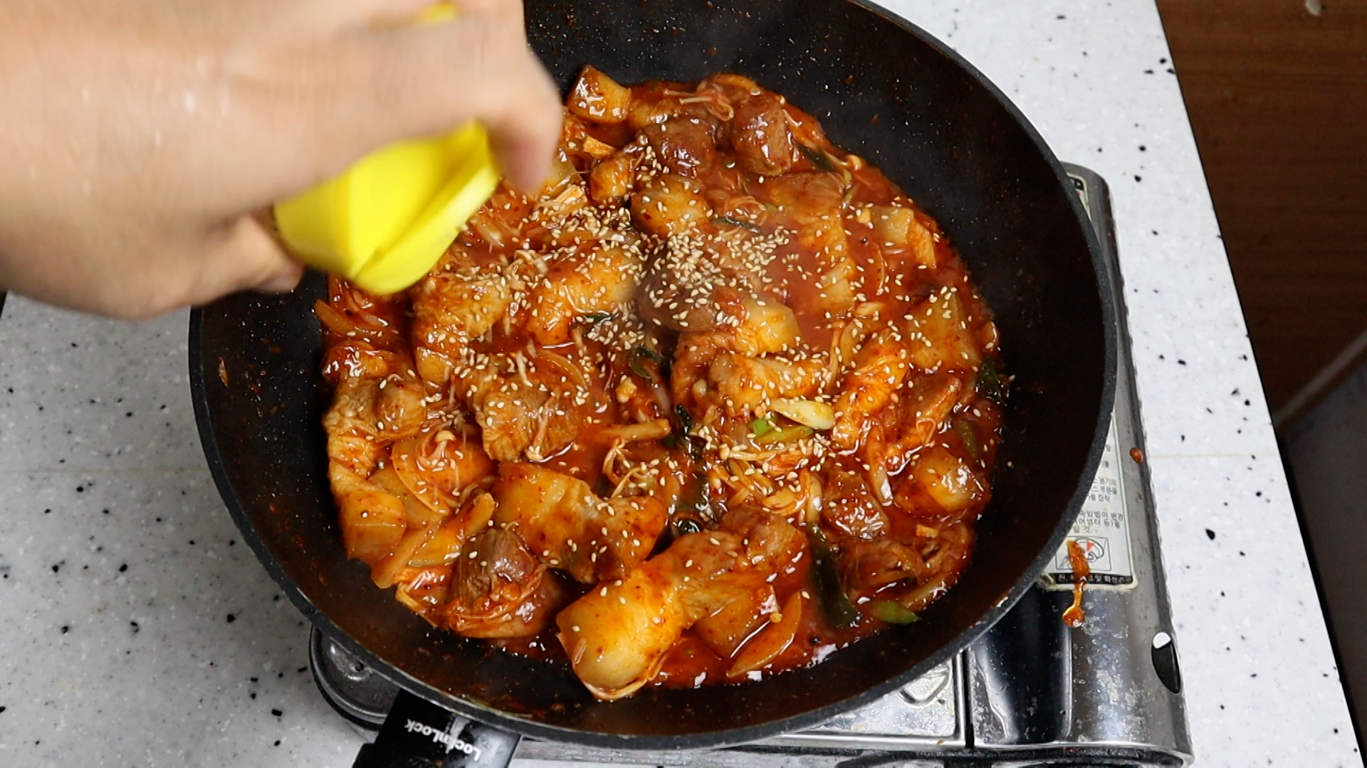 19. 양파숨이 살짝 죽었으면 강불 그대로 유지하고 양념을 부어주세요.