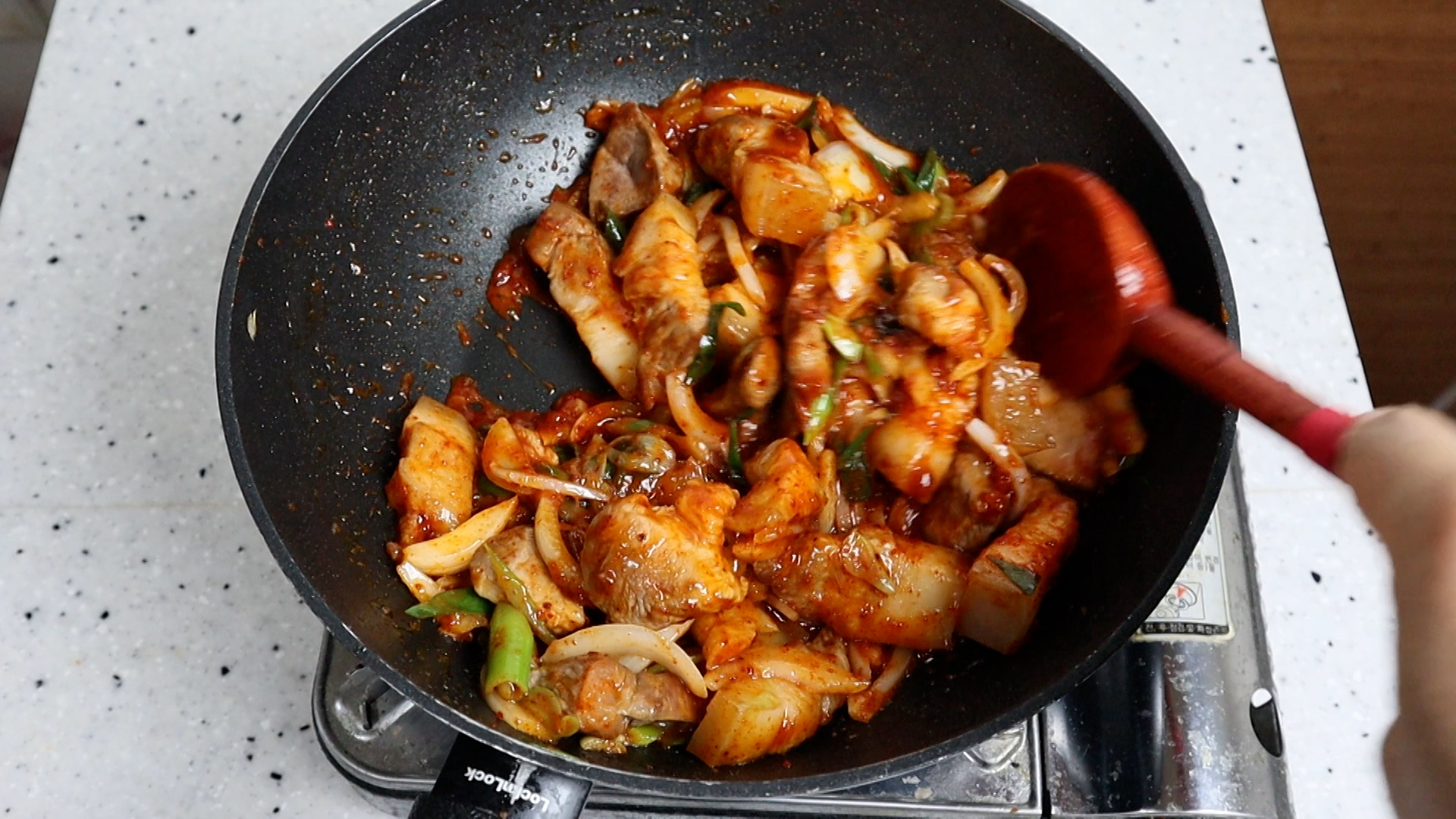 20. 돼지고기 기름에 양념이 골고루 튀겨지듯 볶아지면 양념맛이 2배는 맛있어 진답니다~ 1분 10초 정도 골고루 섞어가며 볶아주세요.