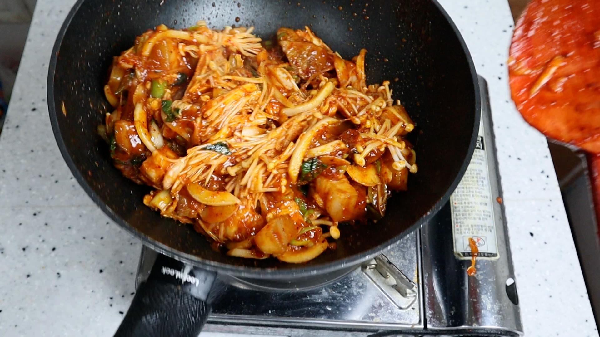 21. 팽이버섯은 꼭!! 마지막에 넣어주셔야합니다. 팽이버섯은 오래 볶으면 수분이 많이 나와 양념이 질척 거릴수도 있습니다.