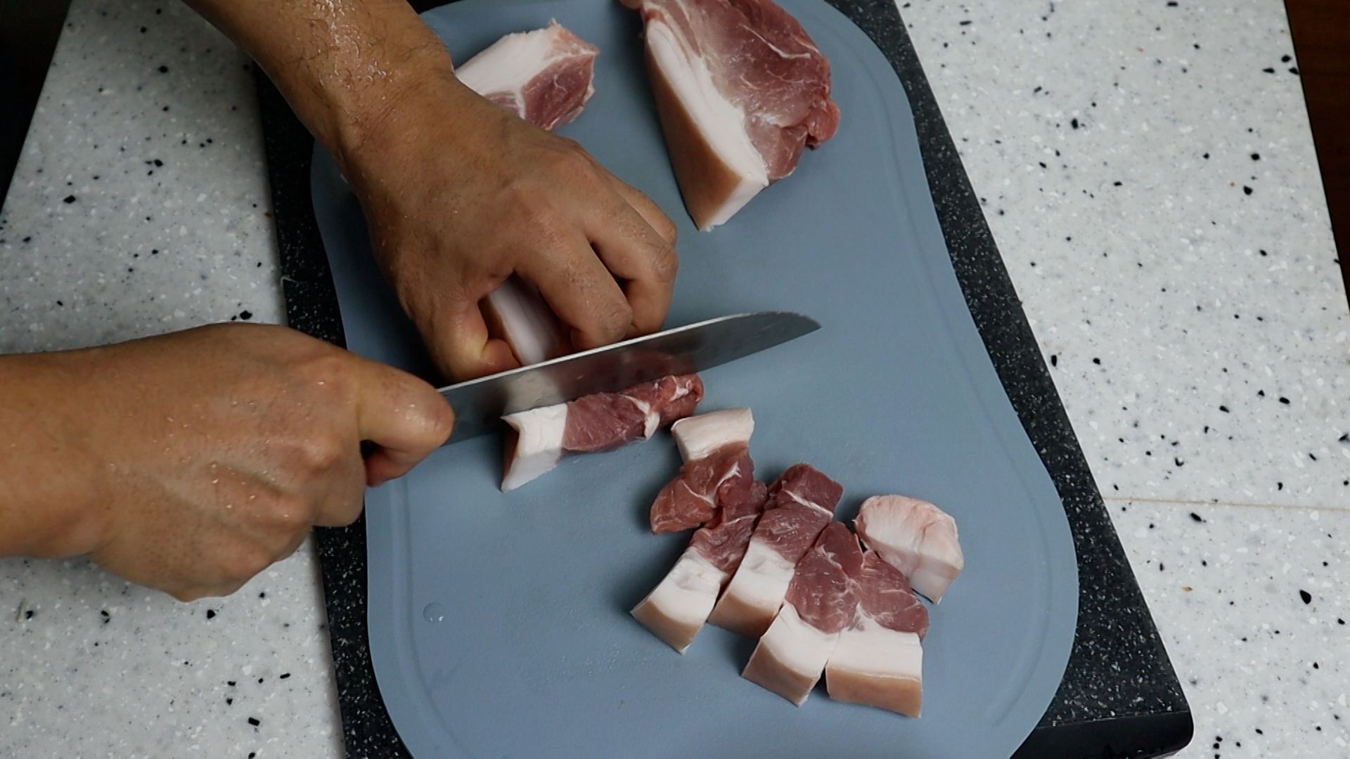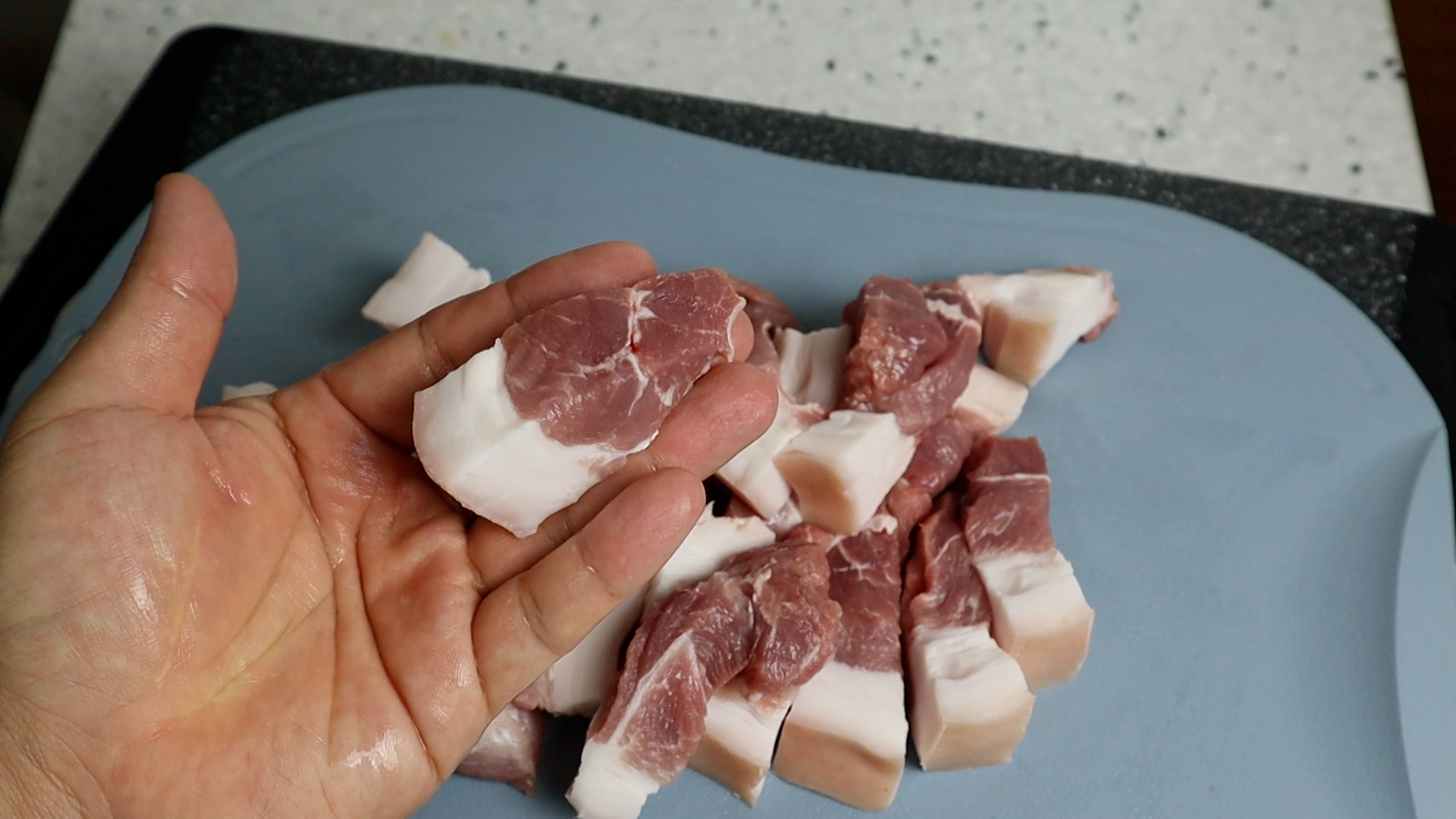 14. 오늘 돼지고기는 1.5~2cm 정도로 두툼하게 썰거에요. 이렇게 하면 고기 육즙이 많이 안 빠져서 식감도 좋고 맛도 훨씬 좋답니다.