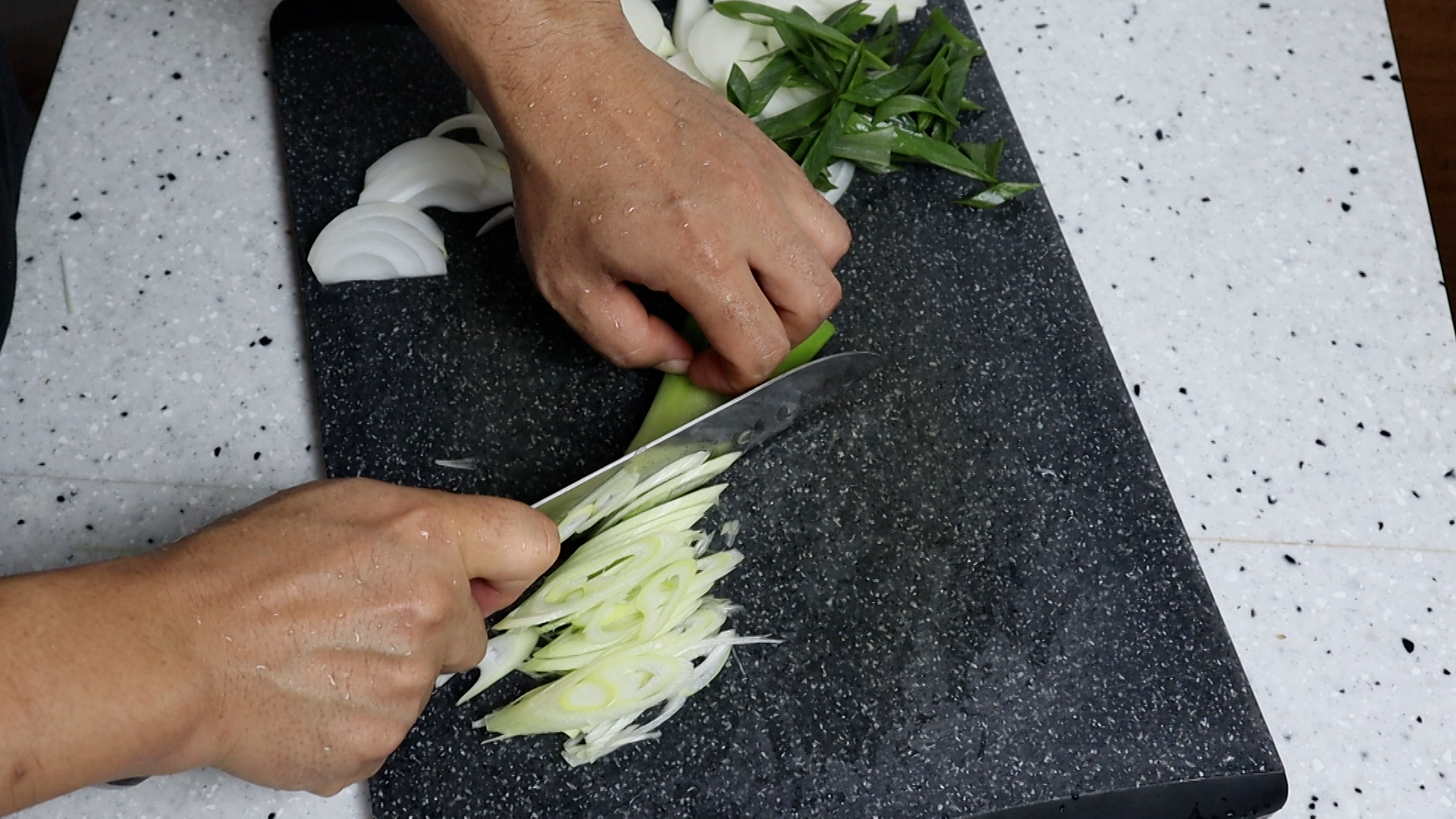 12. 대파는 흰대 초록대를 섞어서 어슷어슷 썰어주세요.