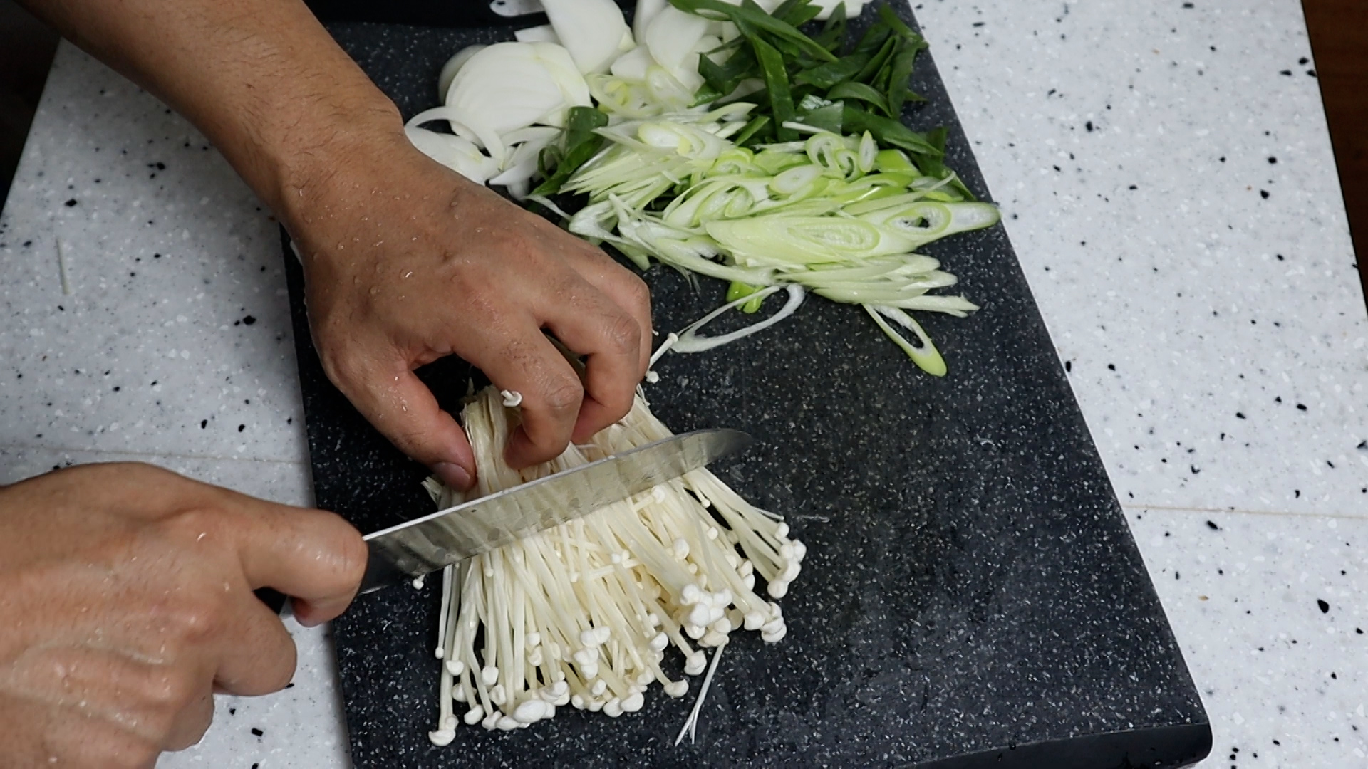 13. 팽이버섯을 세척해서 2/3봉 100g 정도를 몇가닥씩 뜯어서 반으로 갈라주세요.