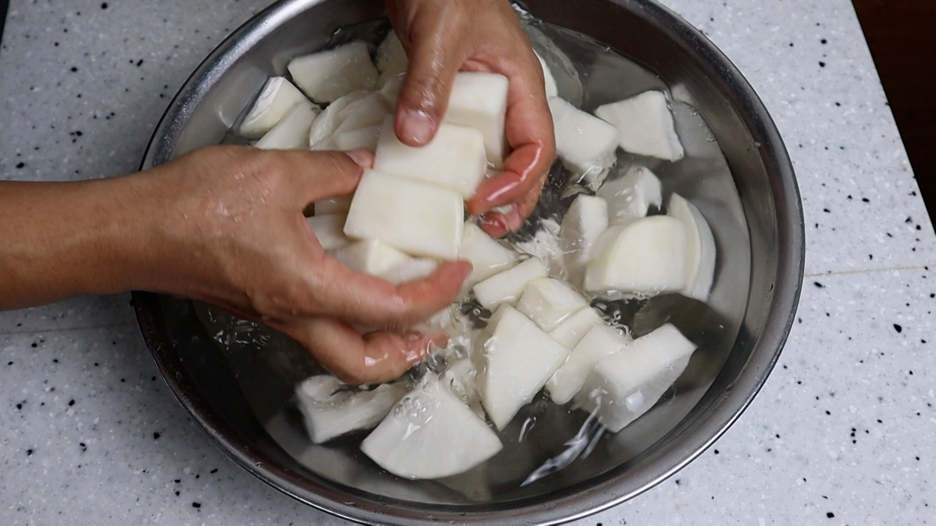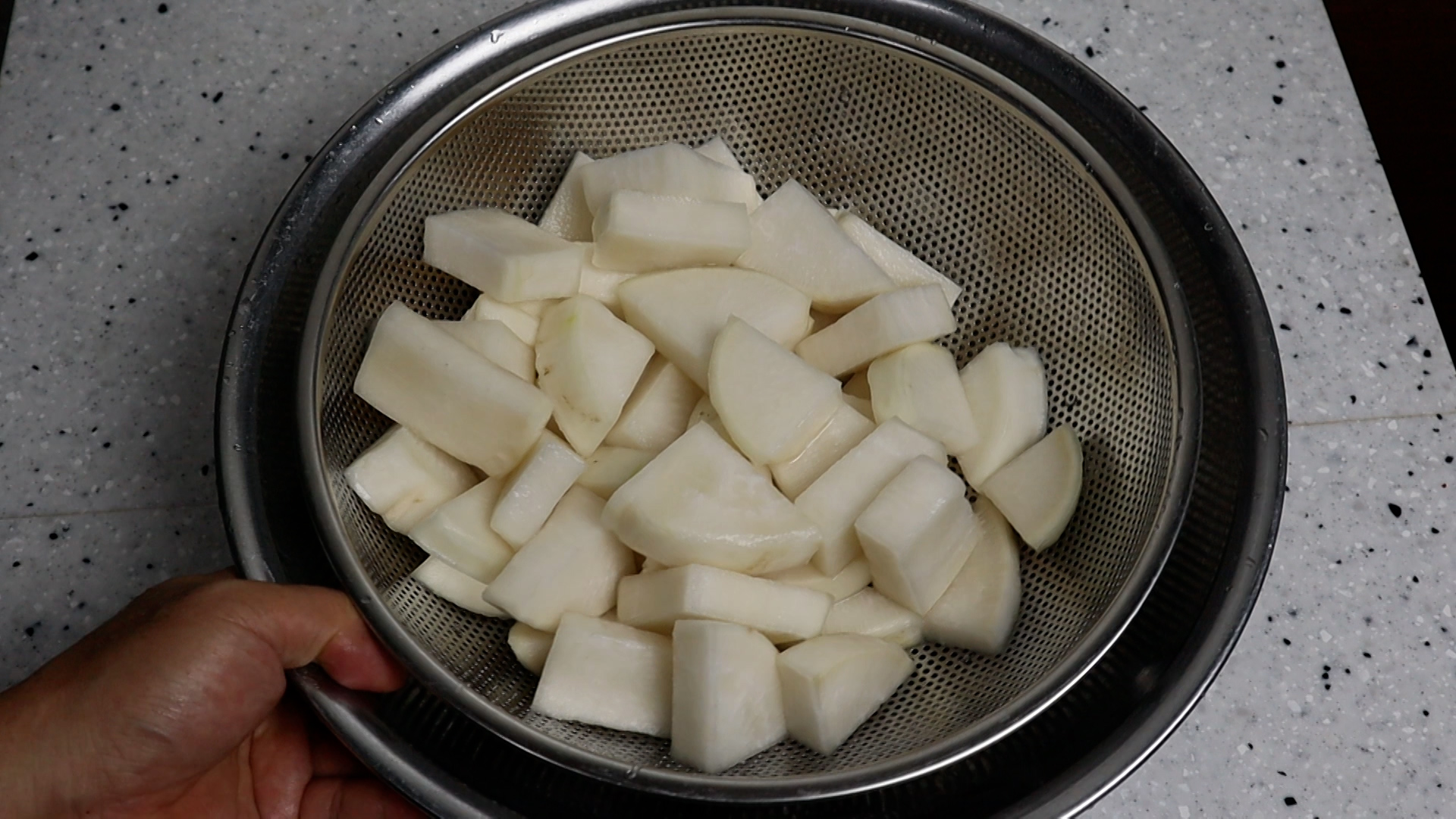18. 1시간 30분 절인 무를 꾹꾹 눌러보면 처음엔 땡땡하게 느껴지던 무가 좀 덜 땡땡 한게 느껴질거에요. 그정도만 절여주시면 됩니다. 여러번 해보시면 감촉을 알수 있습니다.