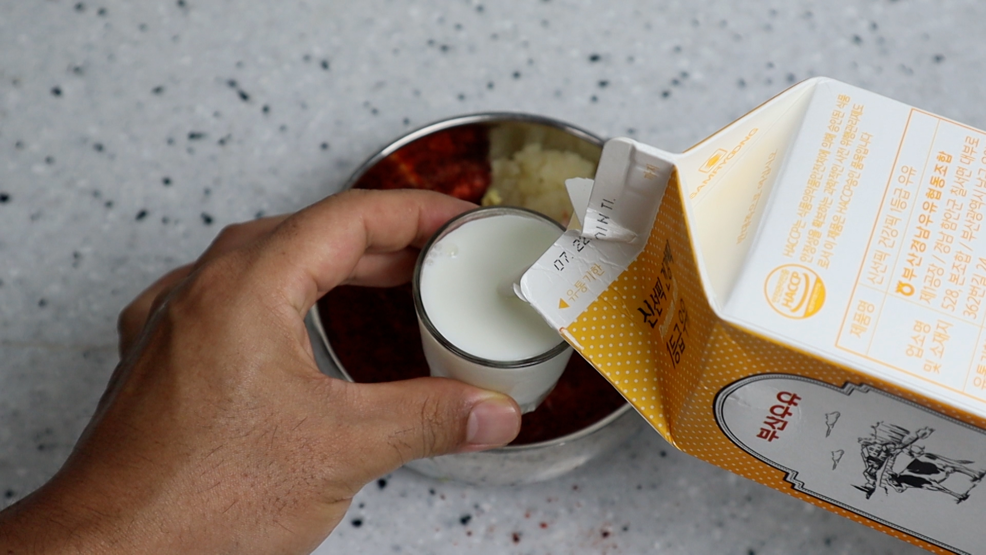 15. 60cc 소주잔에 우유 1컵을 따라 부어주세요. 우유의 단백질이 김치 익는 과정에서 감칠맛을 더 맛있게 해준답니다~ 저지방 우유는 안됩니다!