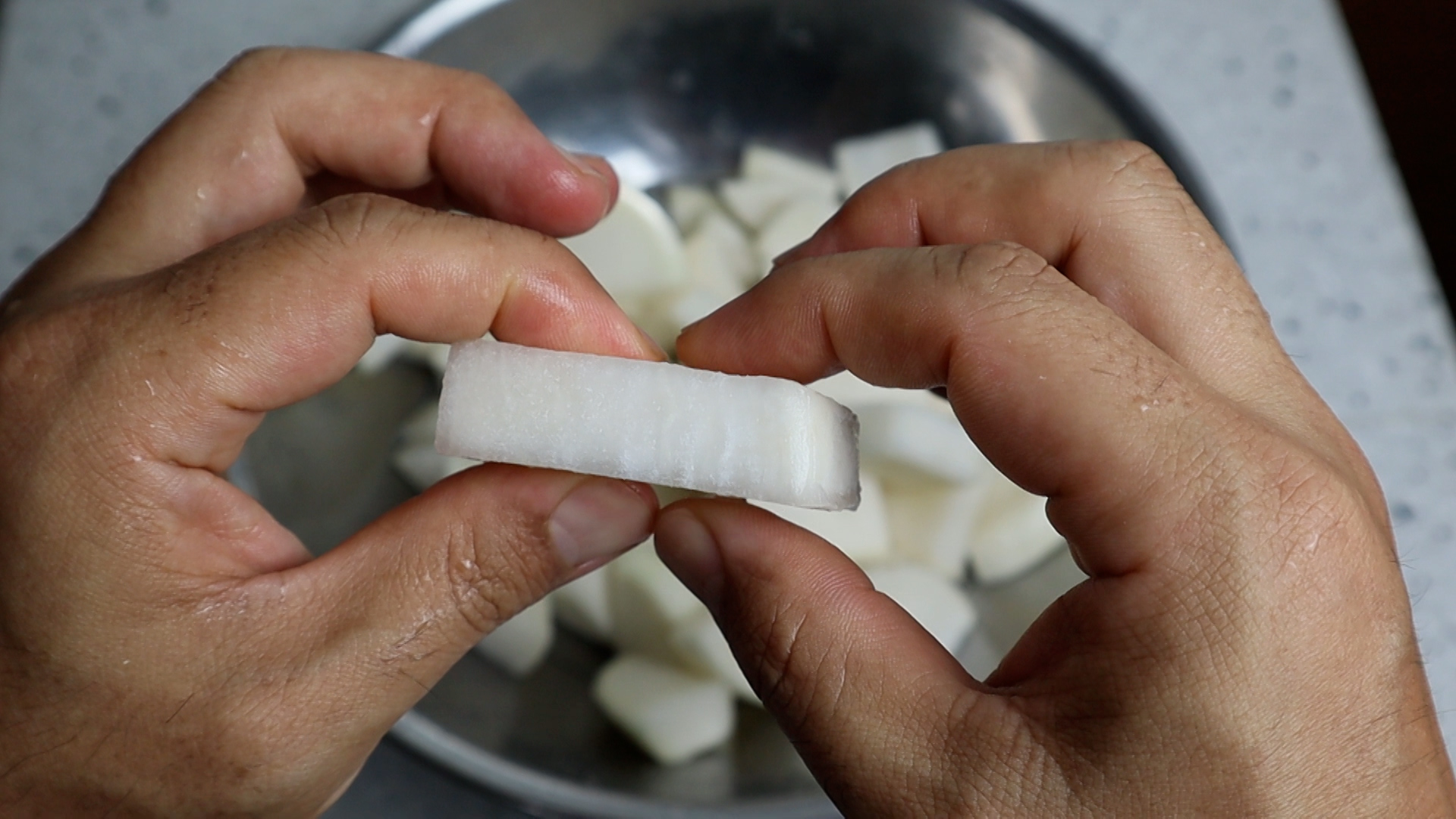 2. 무우는 국밥집에서 자주 보던 큼직큼직한 스타일로 4~6등분으로 잘라 주세요. 너무 큰게 싫으신분들은 좀더 잘게 자르되 두께는 유의해서 잘라주세요.