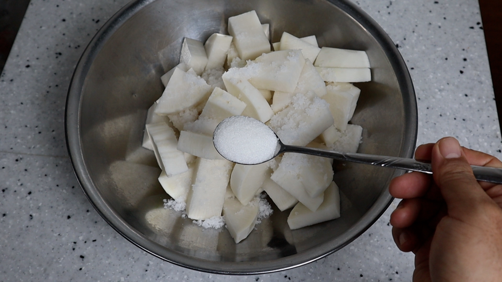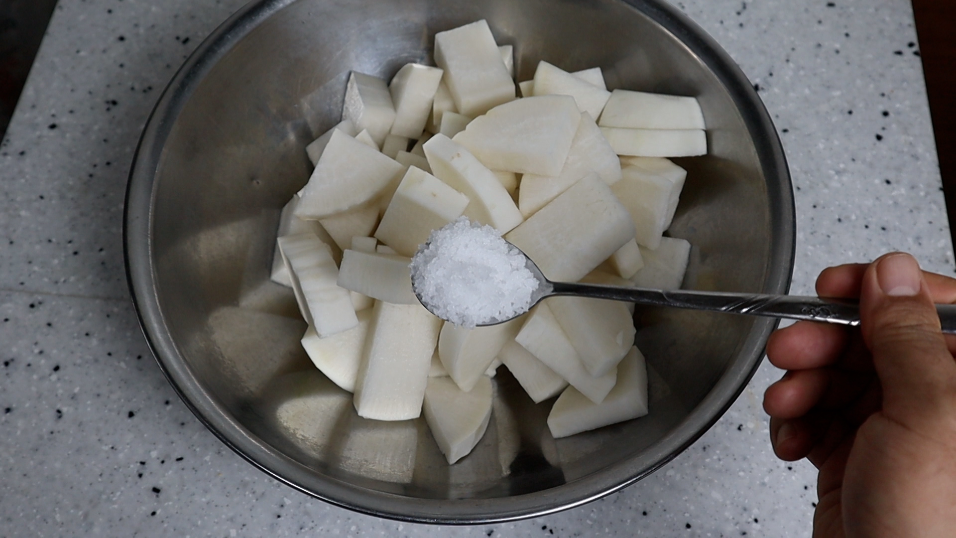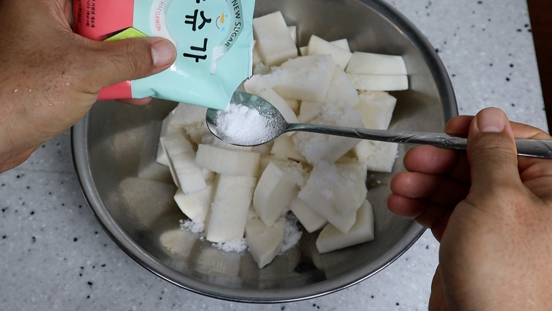 6. 대략 1/4스푼 3g 정도 뿌려주시고 무가 쓴맛이 너무 강하다면 1~2g 정도 더 넣어보세요.