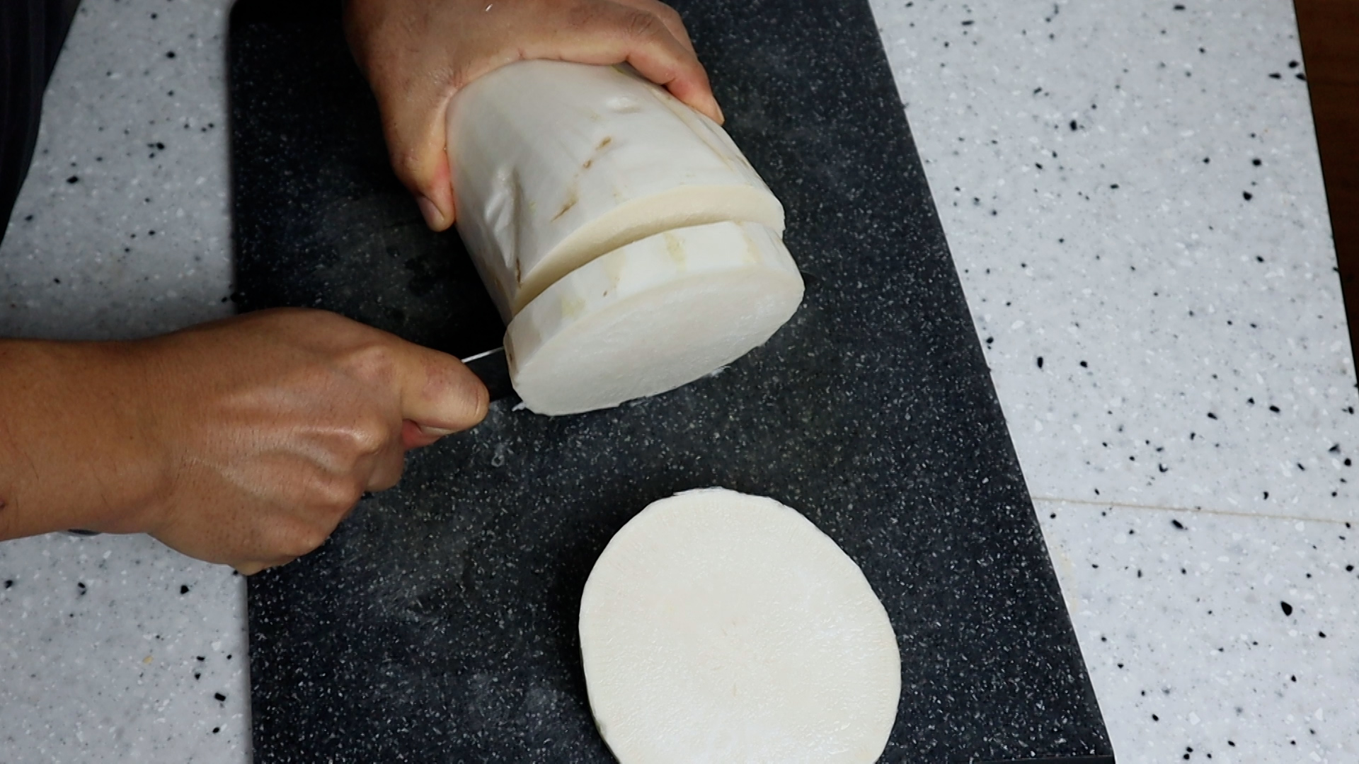 1. 무는 대략 1.5cm 정도 두께로 썰어주세요.