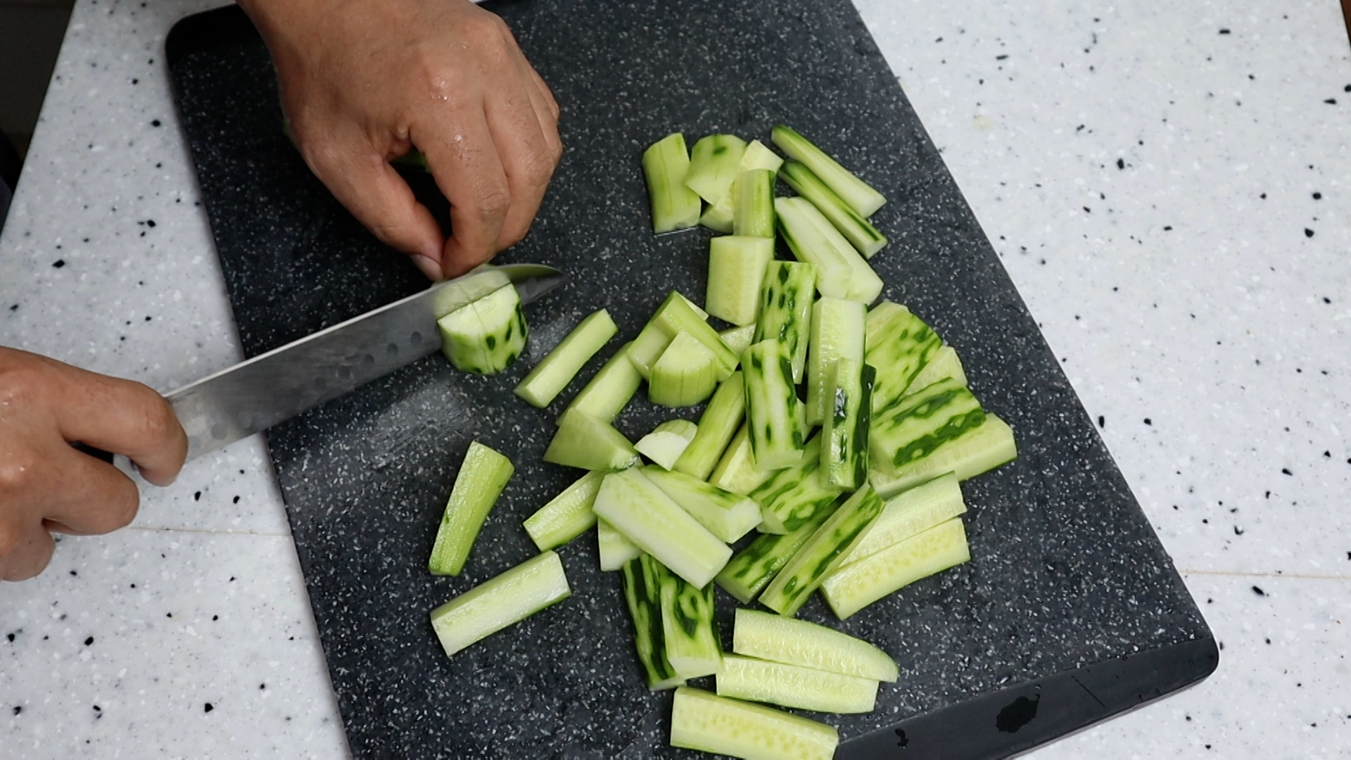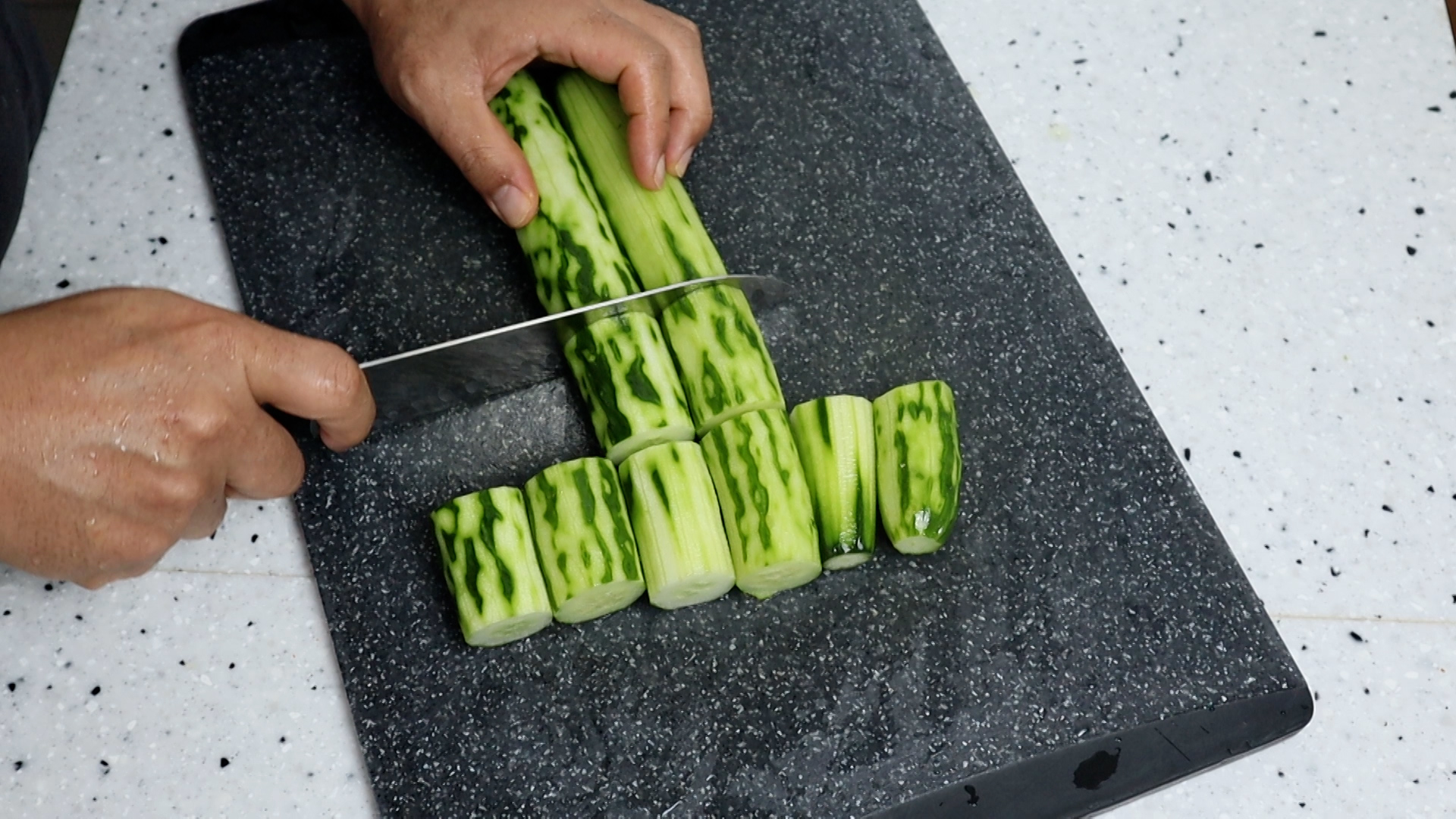 12. 오이를 새끼손가락 2마디 대략 4cm 정도 길이가 되게 썰어주세요.
