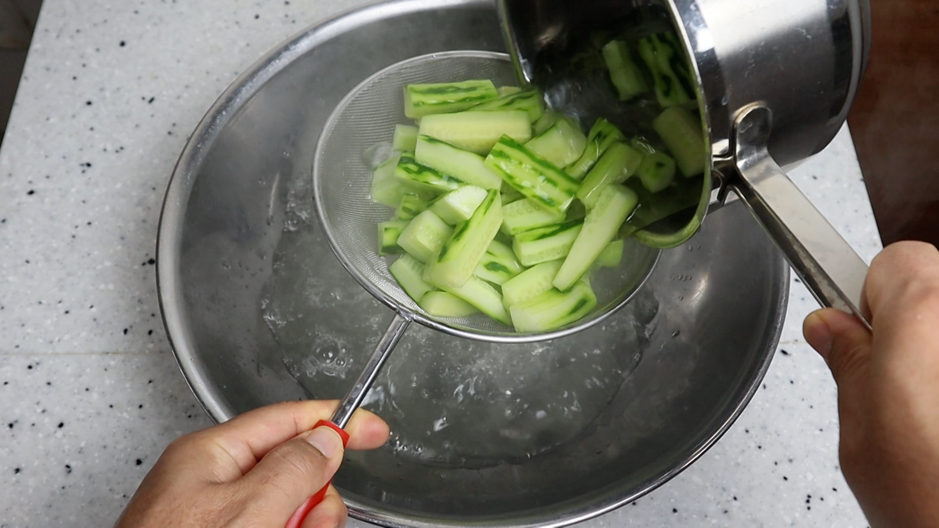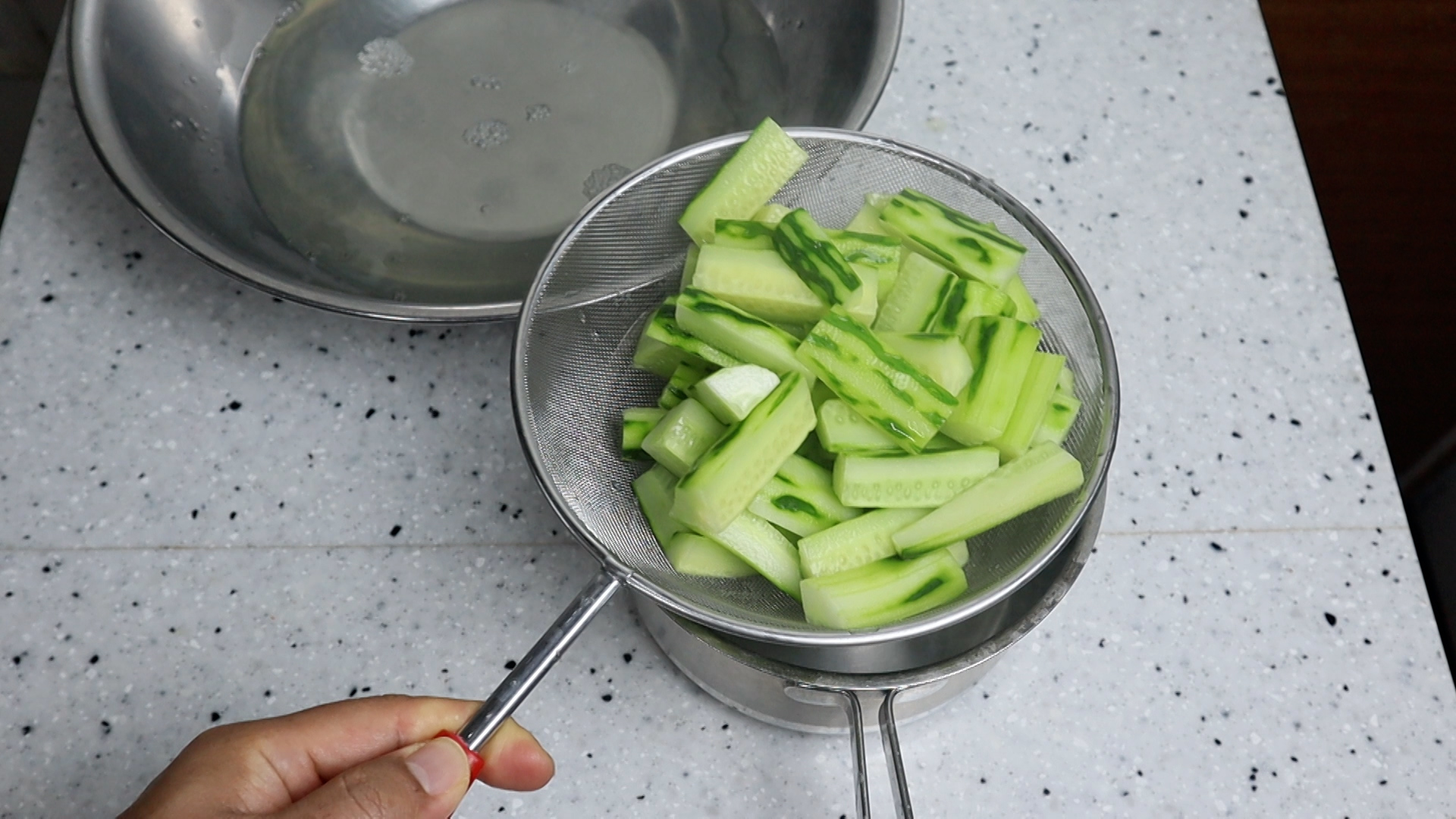 20. 뜨거운물에 절인 오이를 채반에 부어 물를 버려주세요.