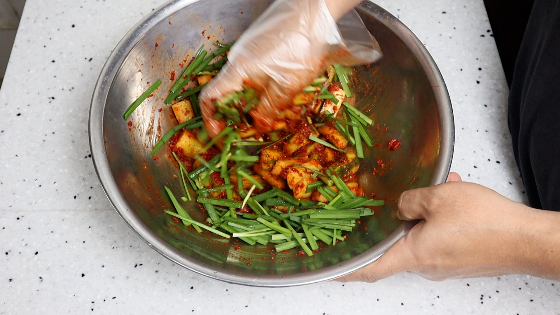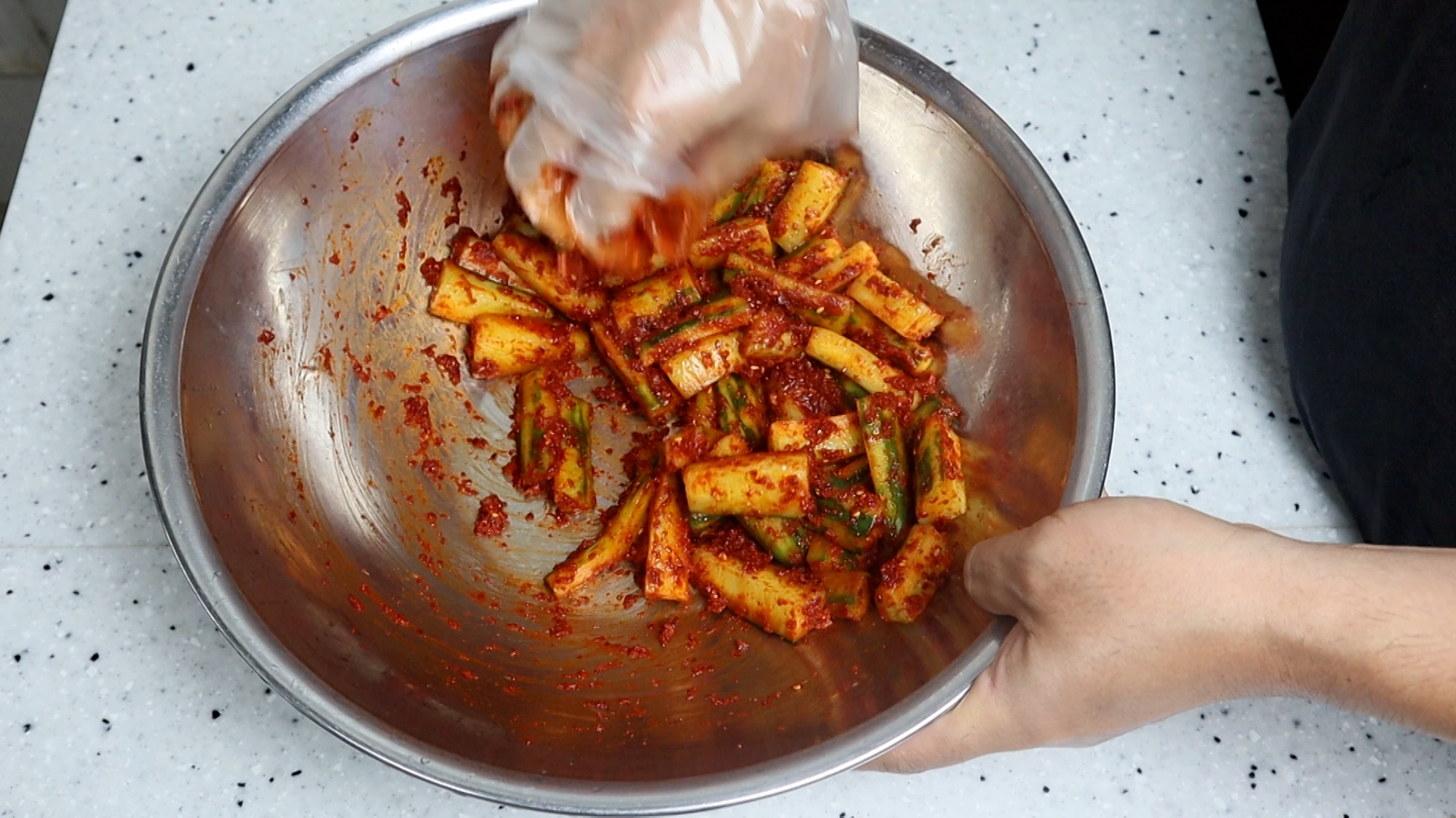 22. 물기 뺀 오이에 양념을 전부 넣고 버물버물 버무려주세요.