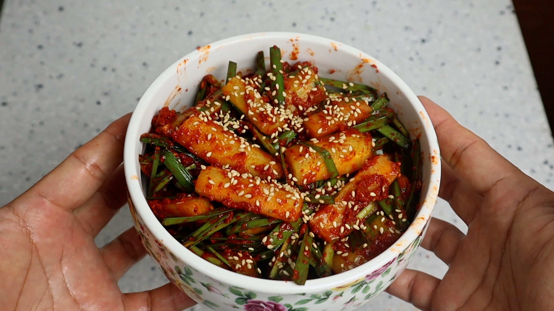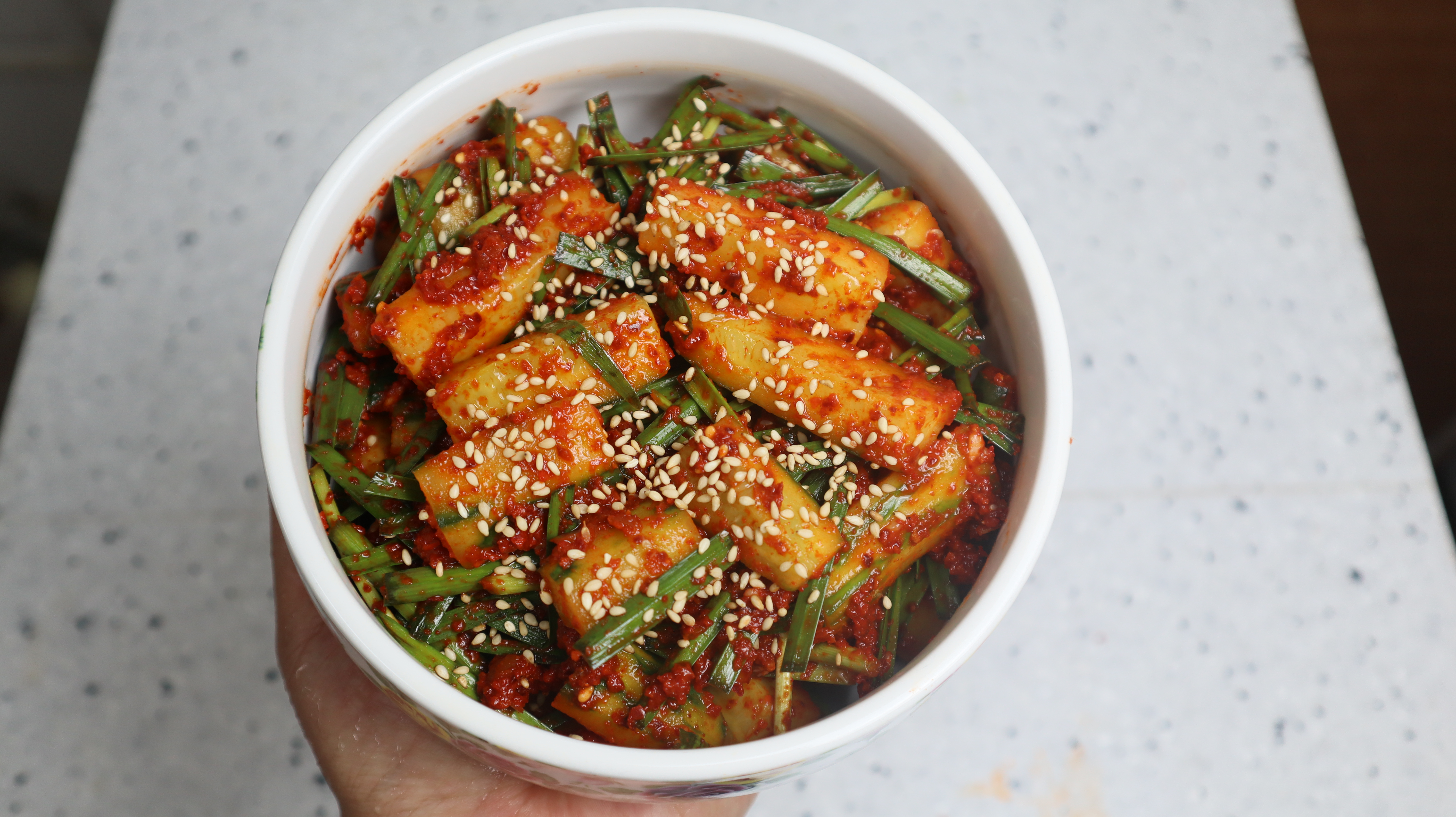 24. 밀폐용기에 오이와 부추를 담고 통깨를 살짝 뿌려주시고 바로 드시는것 보단 2~3시간 냉장실에 넣은 다음 시원하게 먹으면 더욱더 맛있습니다.