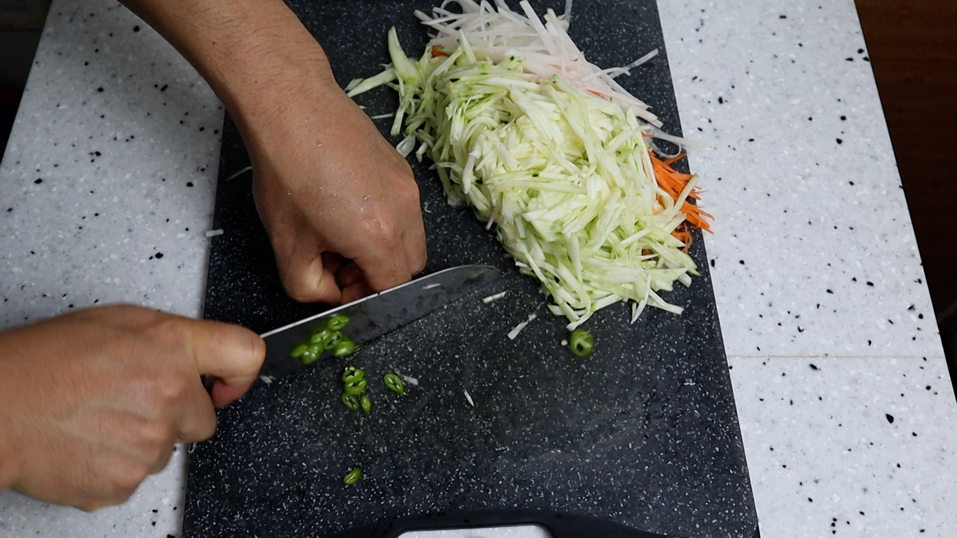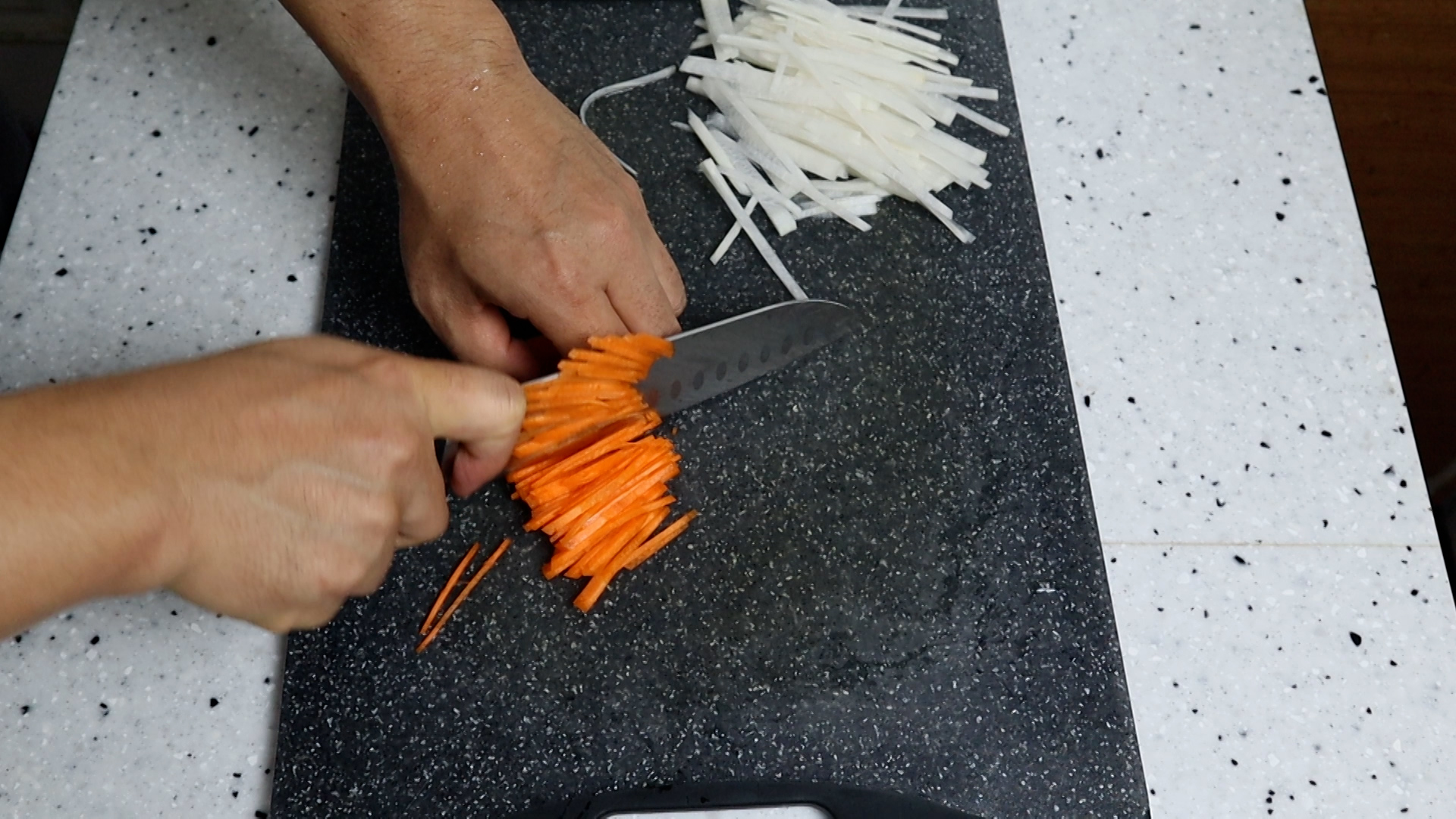 4. 미역을 불리는 동안 무를 2mm 로 얇게 채를 썰어주세요. 무가 너무 쓴맛이 강하면 오이를 동량 대체해주시고 무가 너무 두꺼우면 맛이 제대로 안드니 꼭 얇게 썰어주세요.