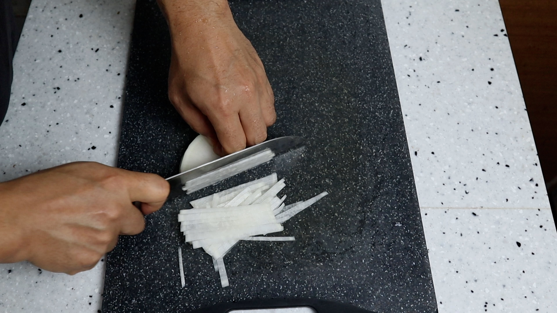 8. 양파도 1~2mm 로 얇게 채를 썰어주세요.