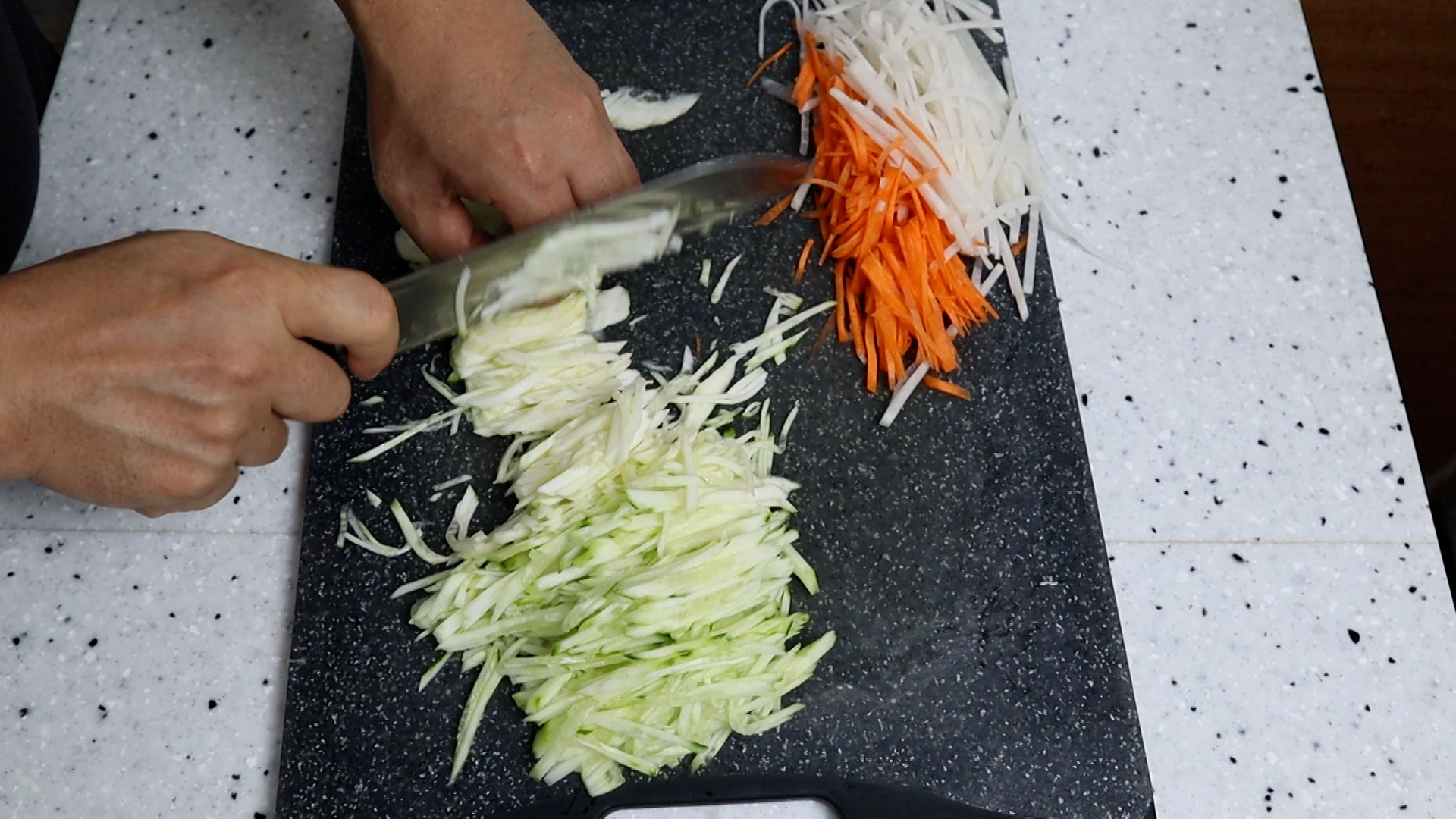 6. 오이는 껍질을 벗기거나 색감을 살리고 싶으시면 소금으로 표면을 박박 문질러 돌기를 없앤 다음 2~3mm 로 채를 썰어주세요