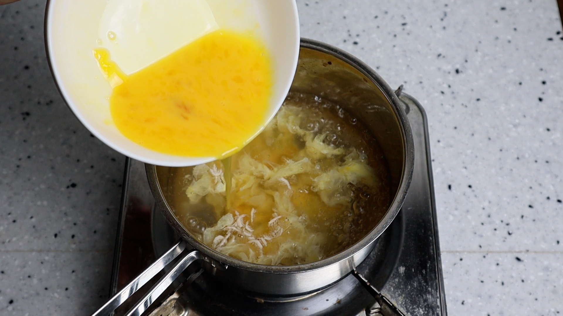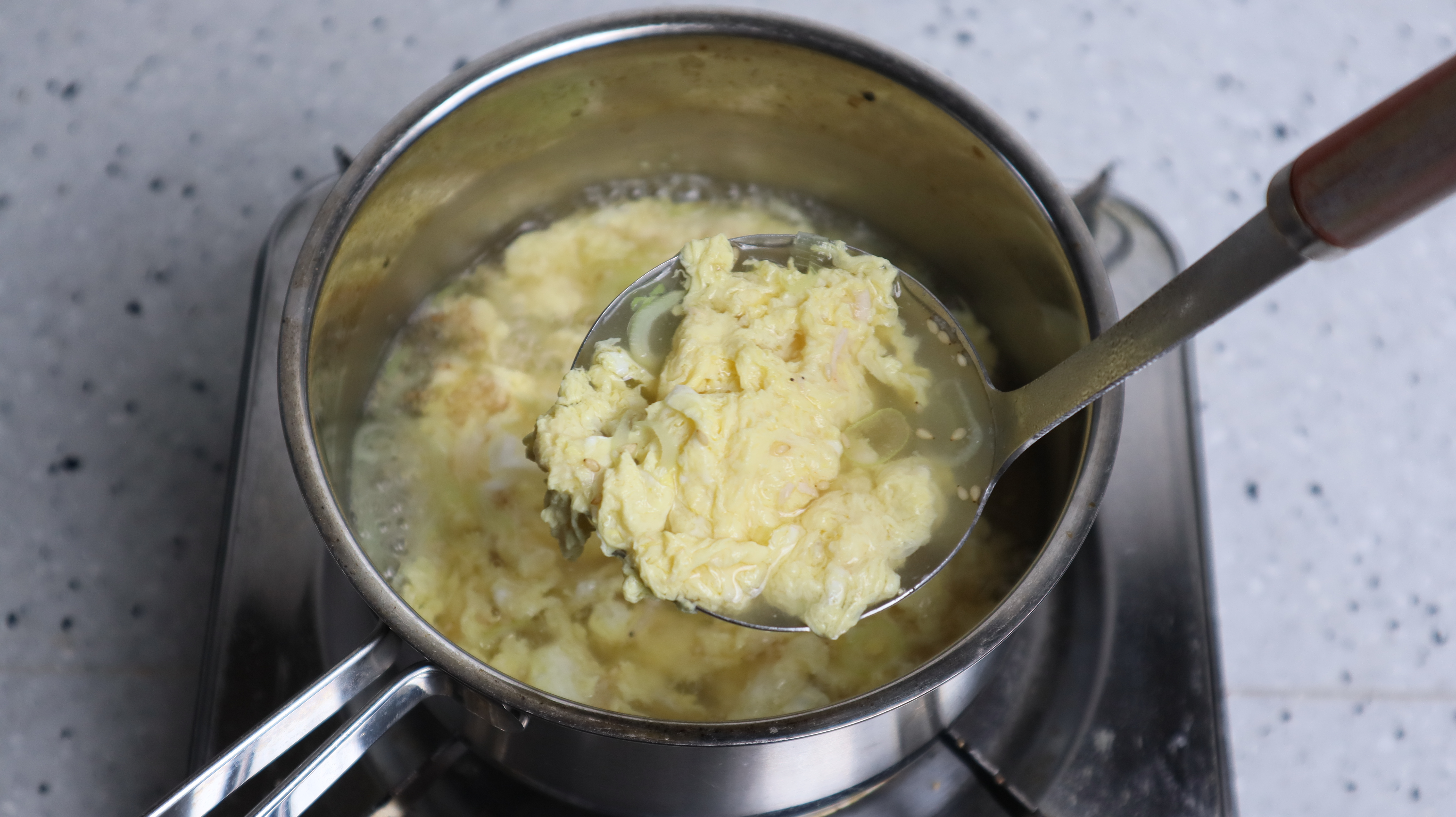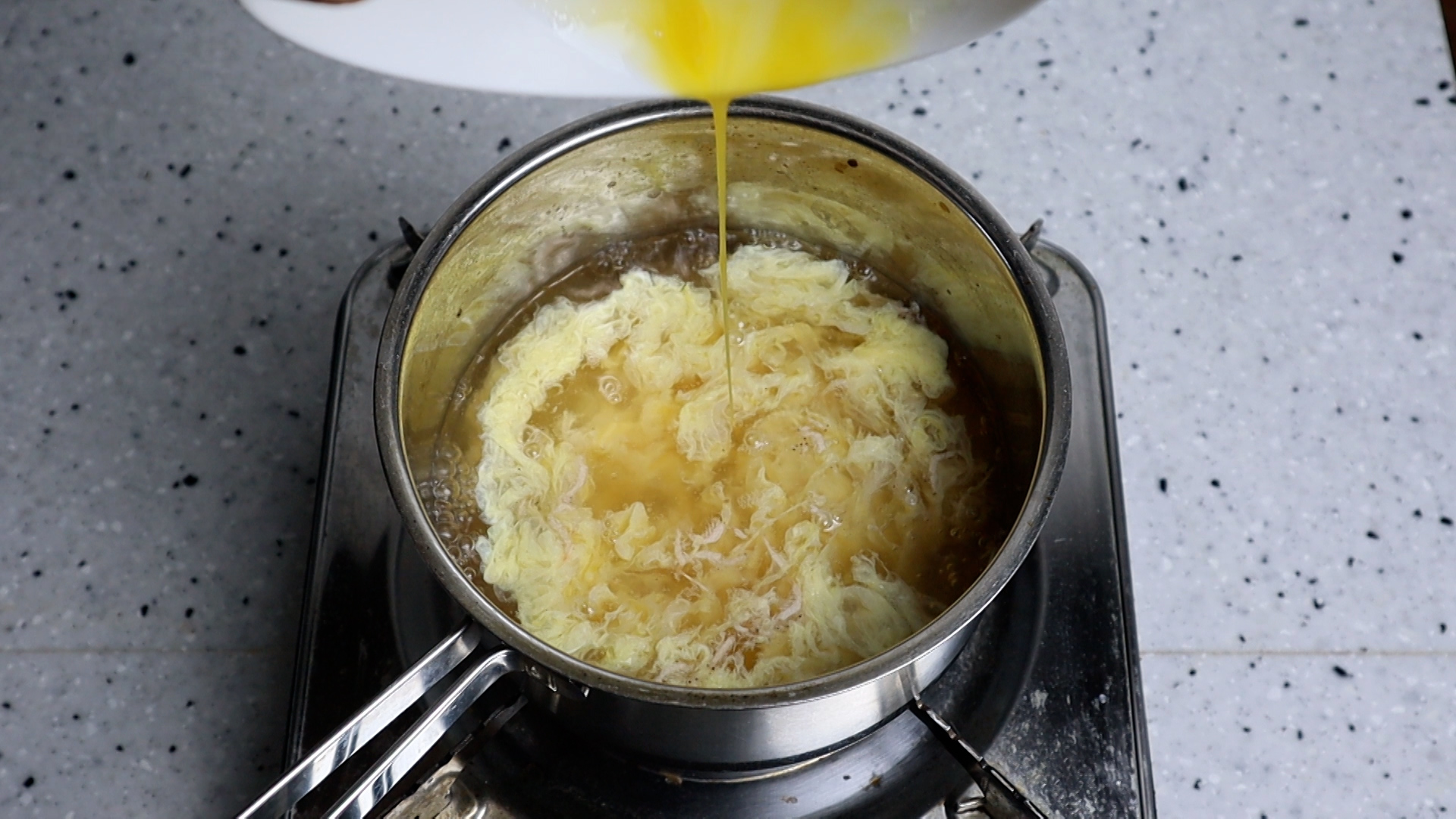 11. 계란물은 한번에 다 붓지 말고 천천히 둘러가면서 부어주세요. 계란물을 부으면서 숟가락으로 살짝 살짝 저어주면 좀더 몽글몽글한 계란탕을 만들수 있습니다.