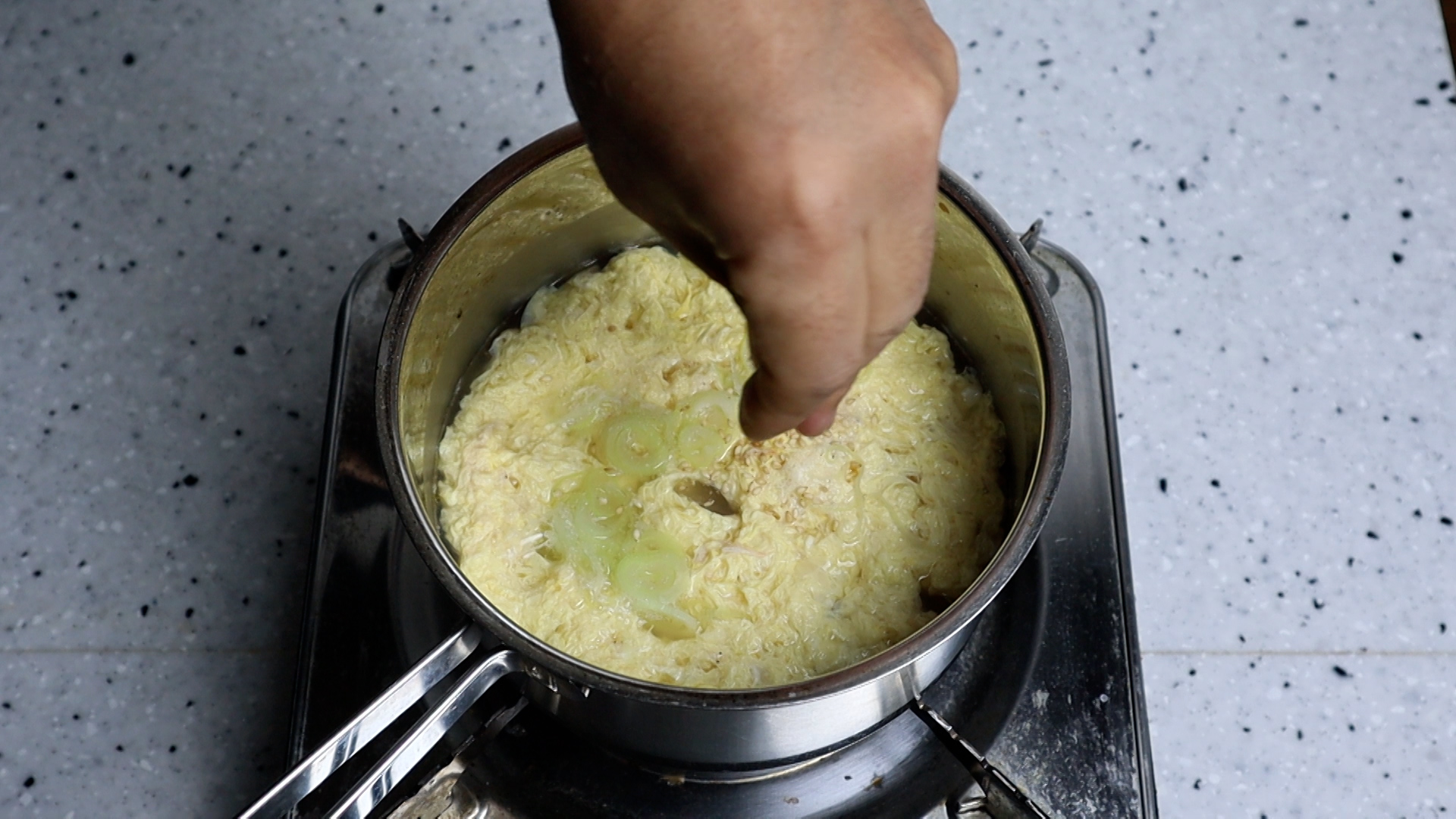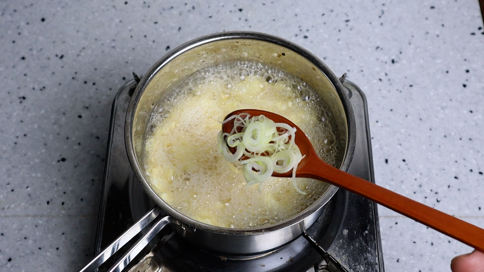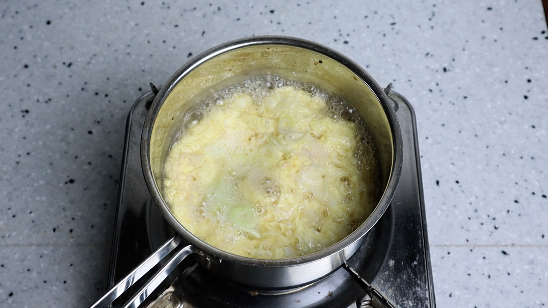 14. 대파 까지 넣고 30초 정도 바글바글 끓여 계란을 완전히 익혀주세요.