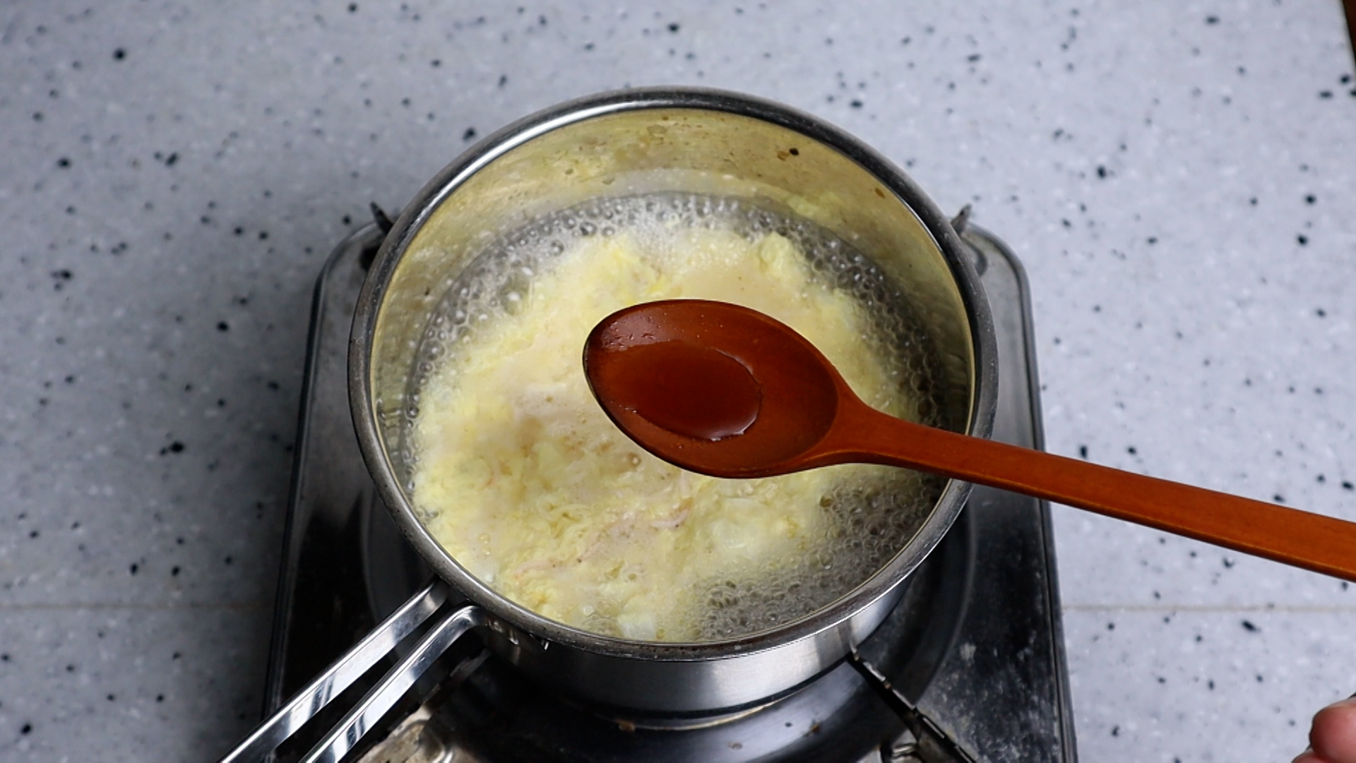 10. 불을 올리고 육수가 바글바글 끓으면 계란물을 부어주세요.