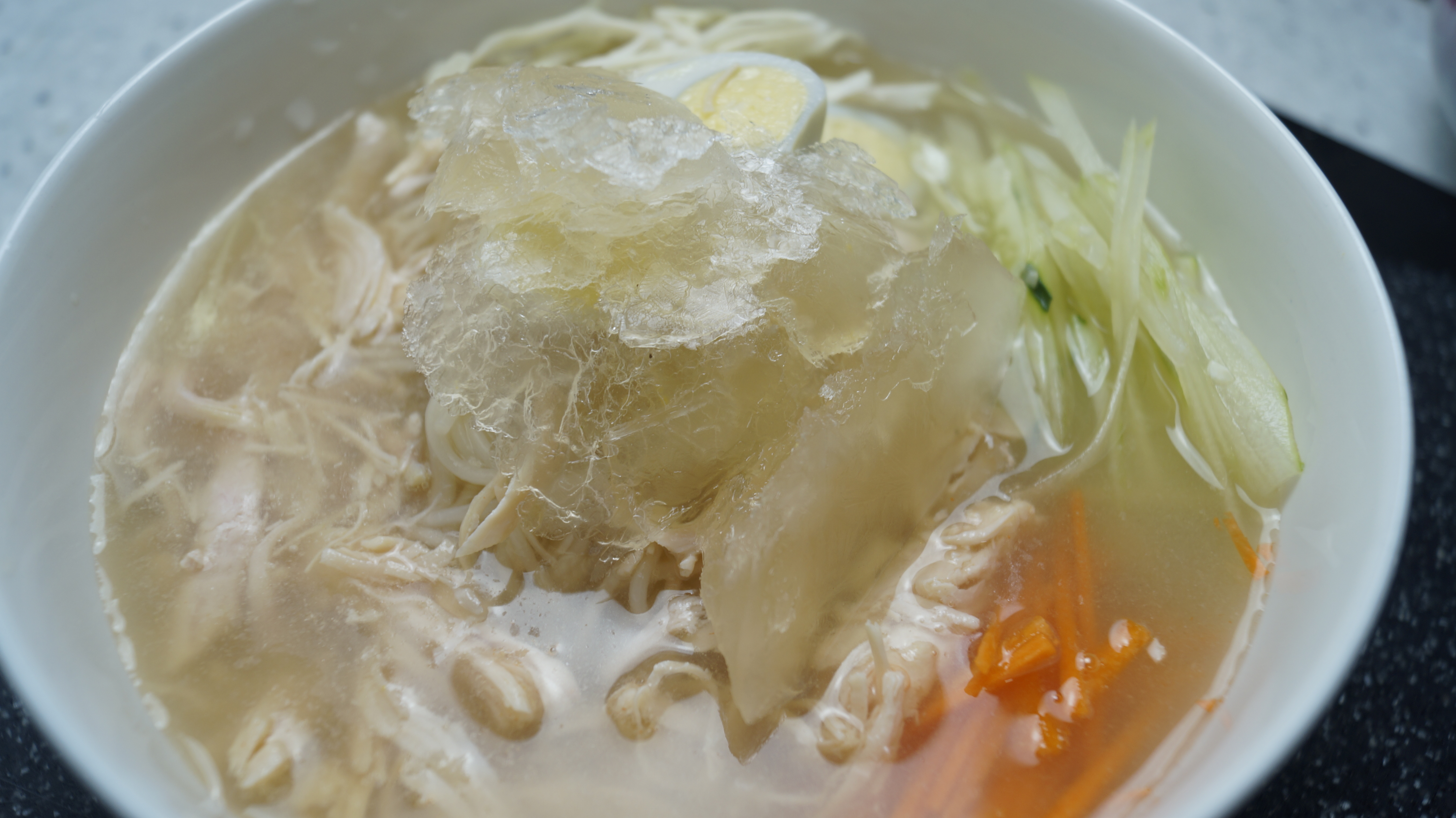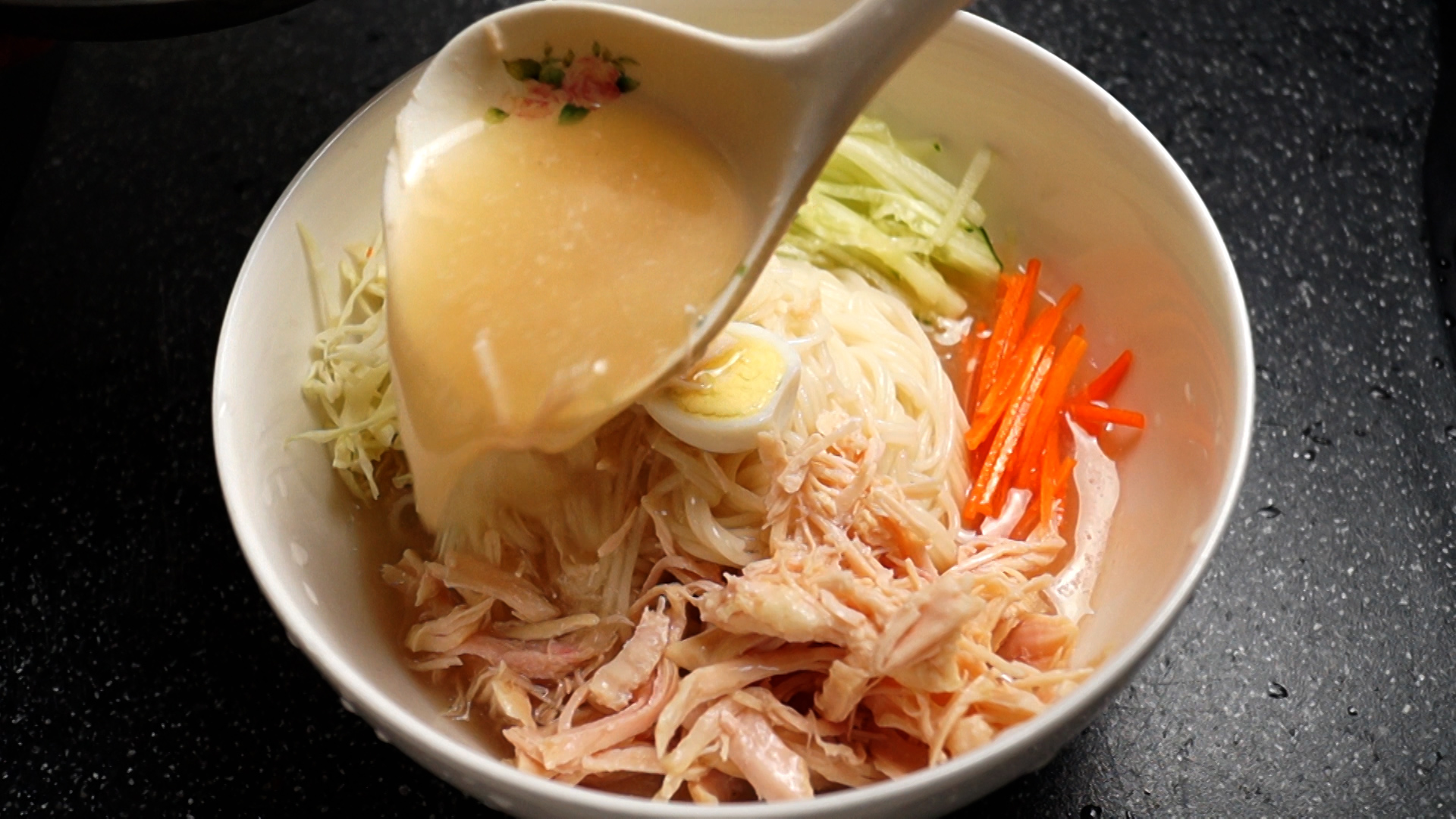 시원하게 식힌 육수와 닭고기에 새콤달콤 육수가 어우러져 한입 먹으면 더위가 싹~ 가시는 맛입니다.